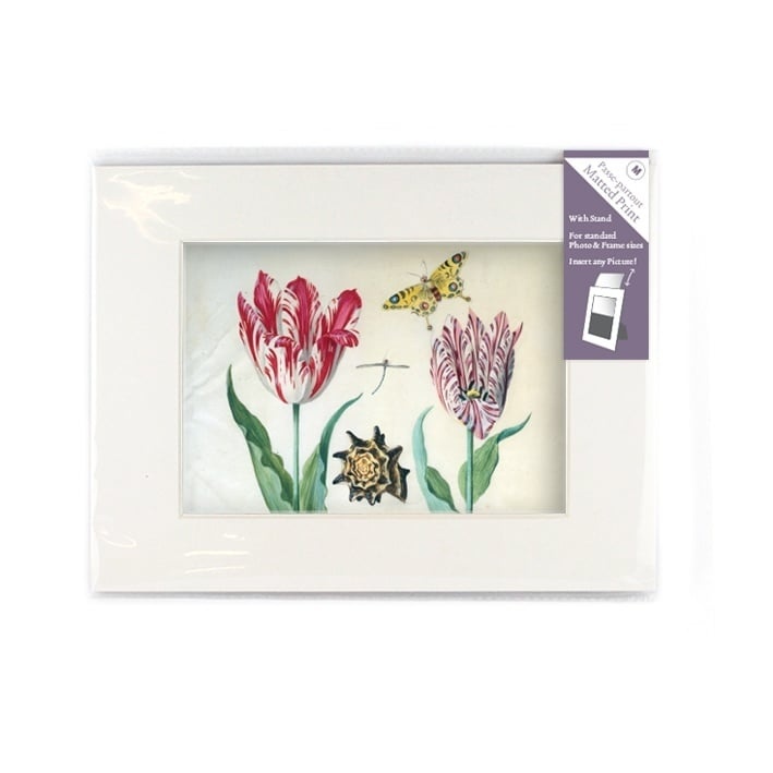 Two Tulips with Shell and Insects, Jakob Marrel (1613 - 1681). Matted print, Medium, Size: 40 x 180 x 4 mm, View size: 162 x 114 mm, Insert size: 168 x 120 mm Material: Front board: Crystal white matt board. Backing board and stand: Black Kraft.