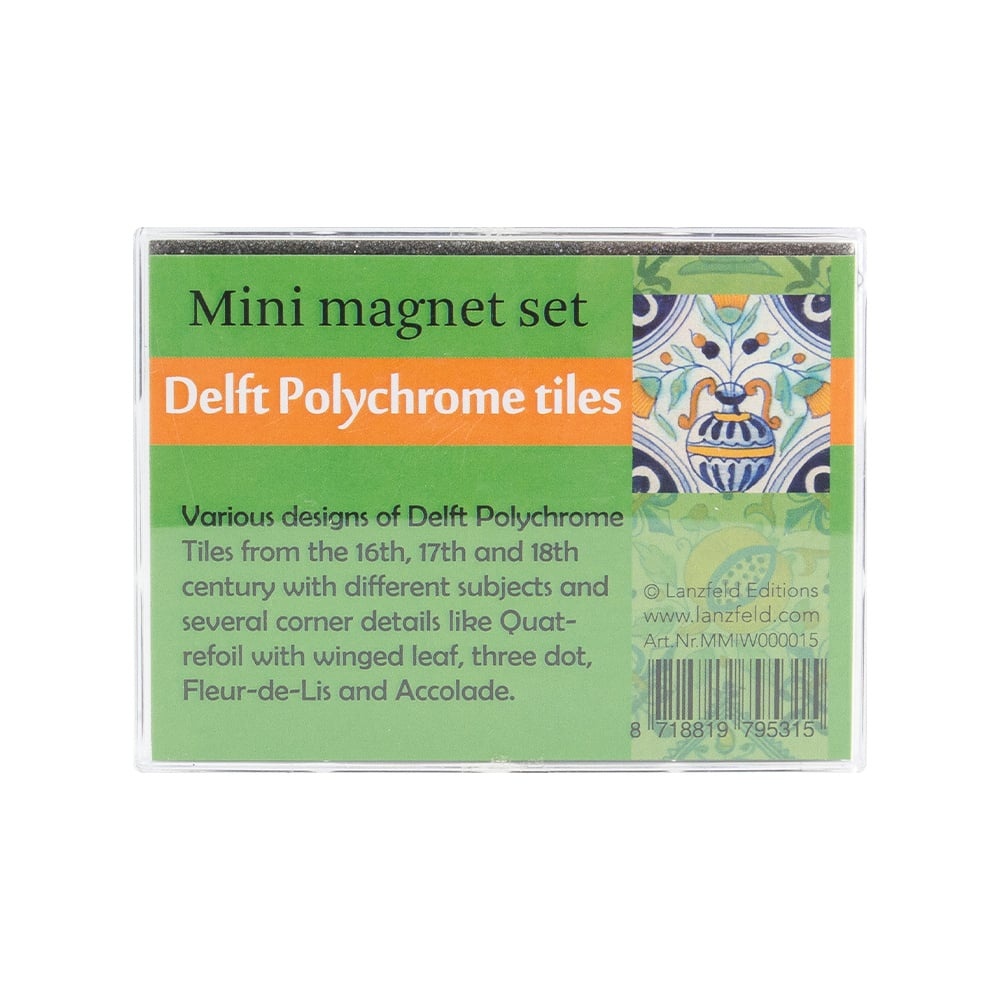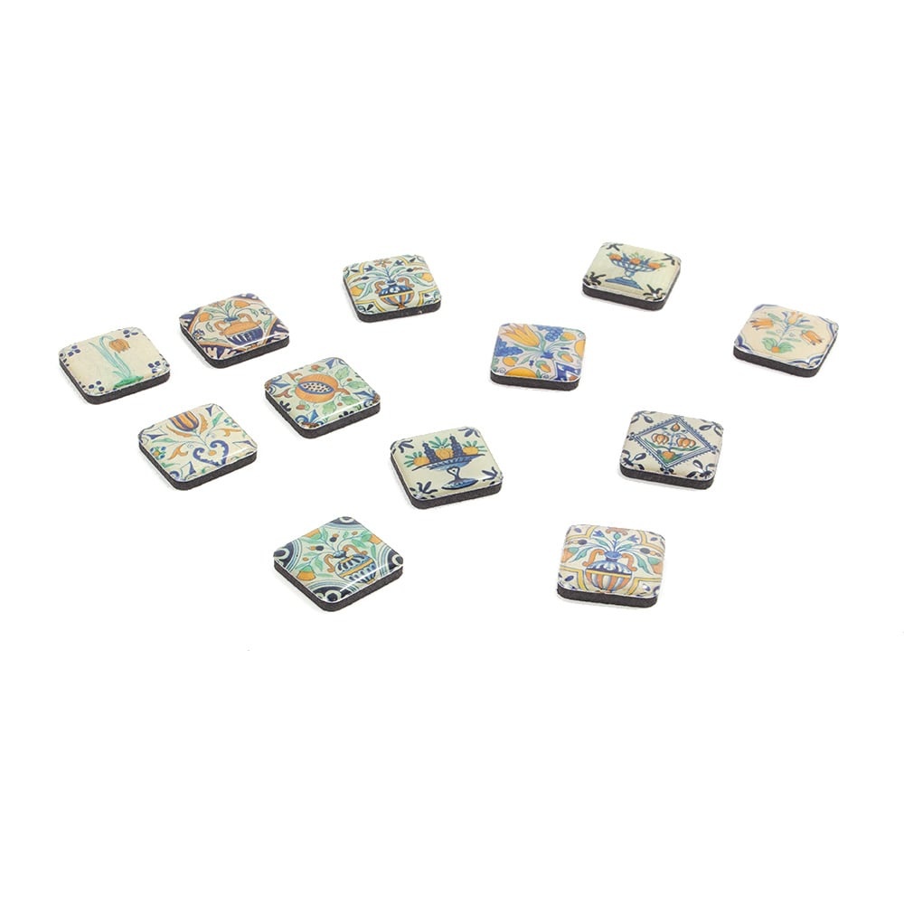 Kühlschrankmagnet mit Bildern von altniederländischen Delfter blauen polychromen Fliesen. Die Auswahl besteht aus 12 Kühlschrankmagneten. Die Magnete werden in einer transparenten Geschenkbox geliefert.