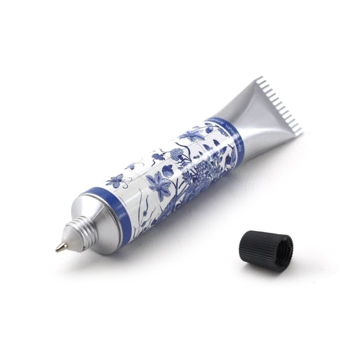 Dieser Stift in Form einer Farbtube hat einen Druck in einem Delfter Blau-Thema: eine Fliesentabelle aus dem Rijksmuseum. Der Farbtubenstift hat eine blaue Schriftfarbe und einen Schraubverschluss. Ein schöner Museumsladen als Geschenk oder Souvenir.