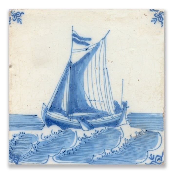 Postcard, Delftblue Tile with Ship at Sea