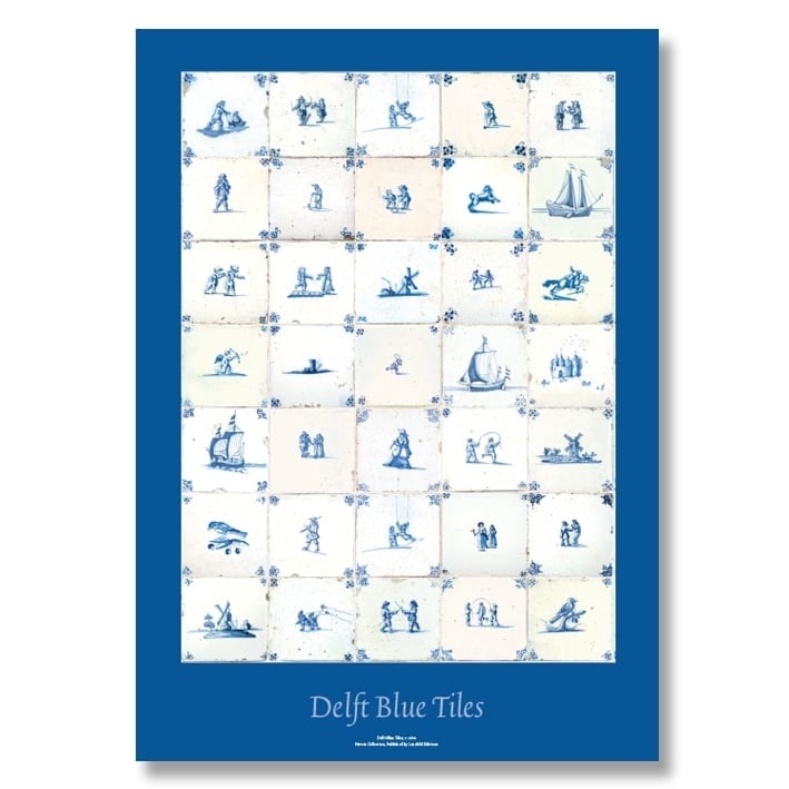 Ein Poster mit 35 verschiedenen Delfter blauen Kacheln. Das Poster mit einer Größe von 50 x 70 Zentimetern ist auf schwerem Papier gedruckt und in einer transparenten Tube mit Produktinformationen verpackt.