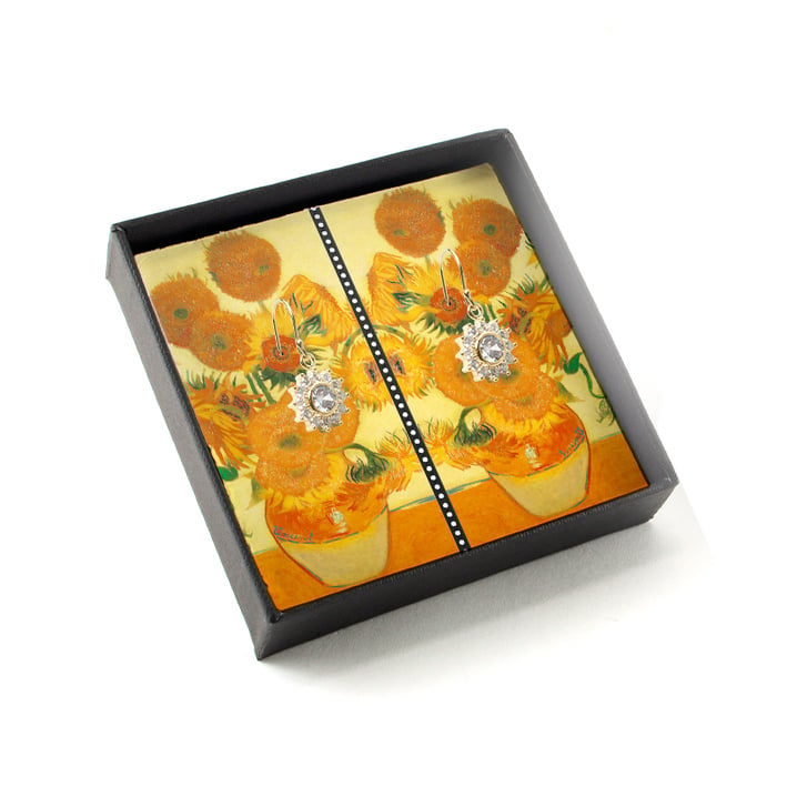 Gold plated earrings with glittering crystal stones, Van Gogh, Sunflowers