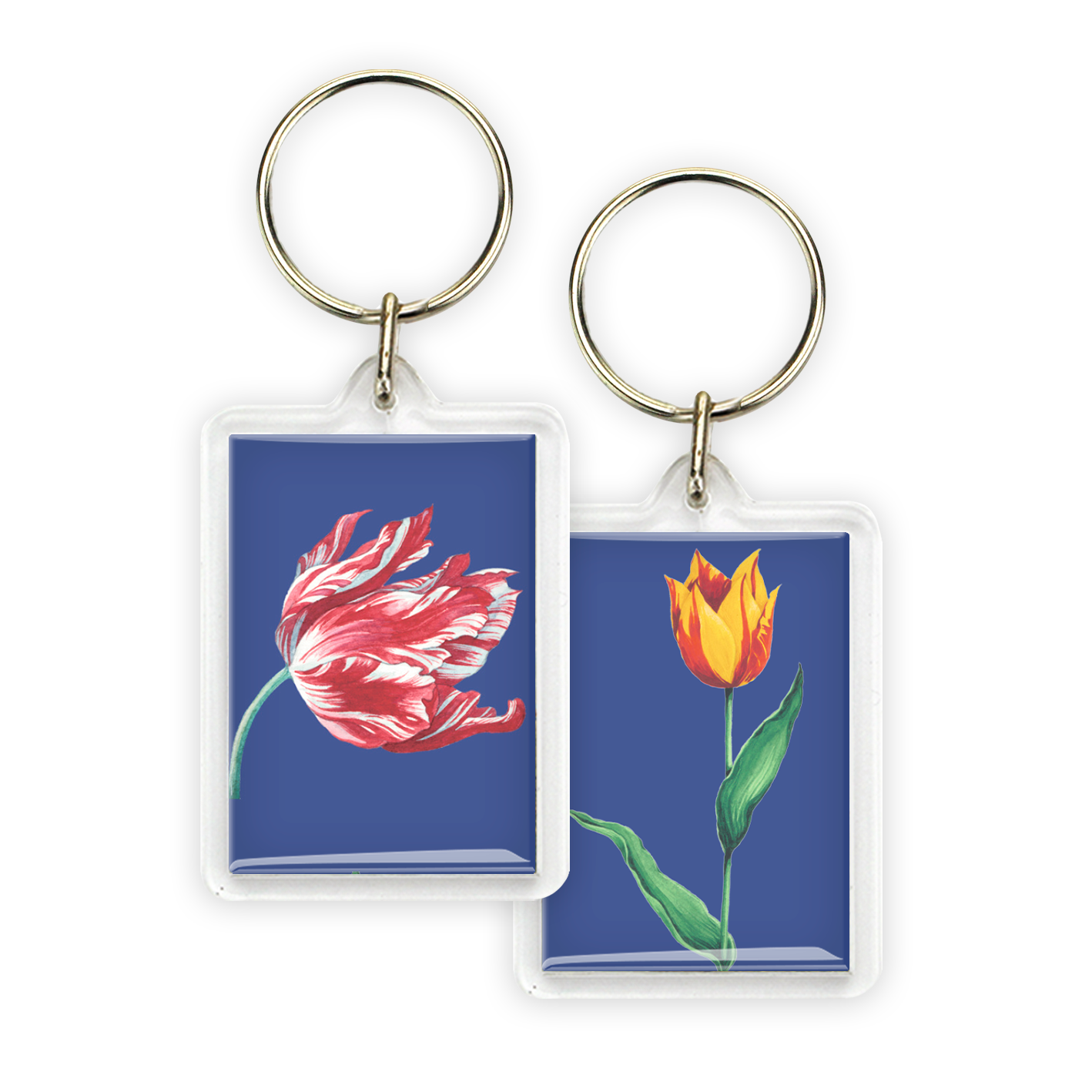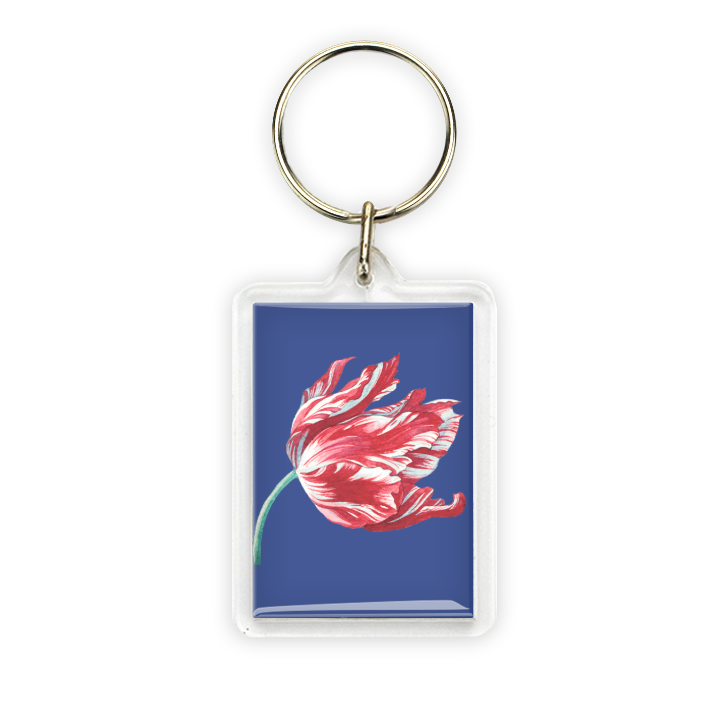 Keyring, Red and yellow tulip on blue background Dimensions: 4,3 x 6,5 x 0,7 cm
