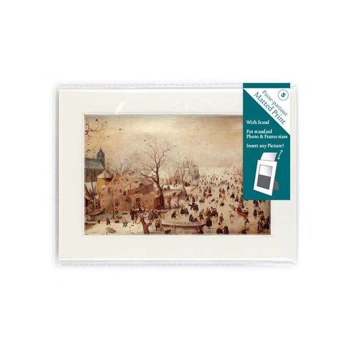 Winter landscape, Hendrick Avercamp (1585-1634). Matted print, small: Size: 4178 x 127 x 4 mm, View size picture: 140 x 90 mm, insert size picture: 150 x 104 mmMaterial: Front board: Crystal white matt board. Backing board and stand: Black Kraft.