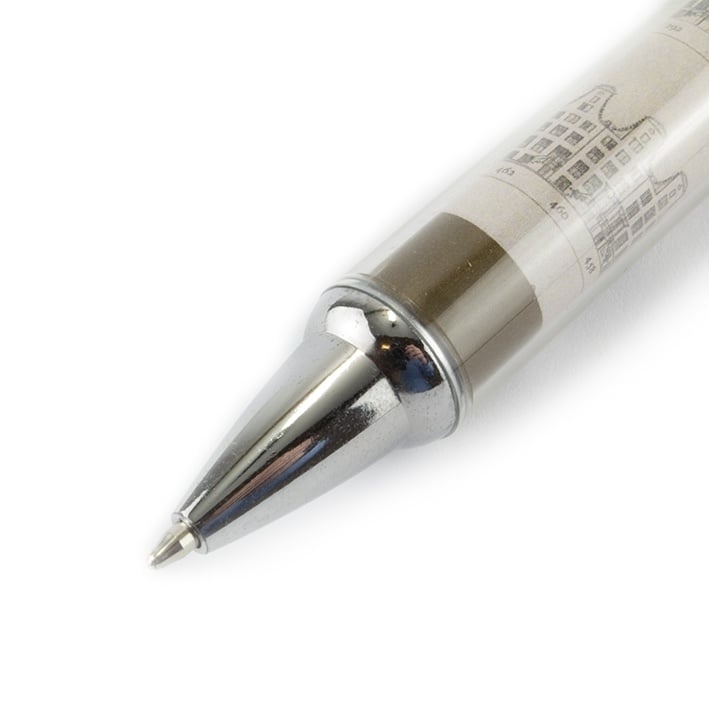 This photo pen has a quality print of the Herengracht, Amsterdam, a drawing by Caspar Philips Jacobszoon. The print is inlaid behind a transparent layer, writing color; blue.