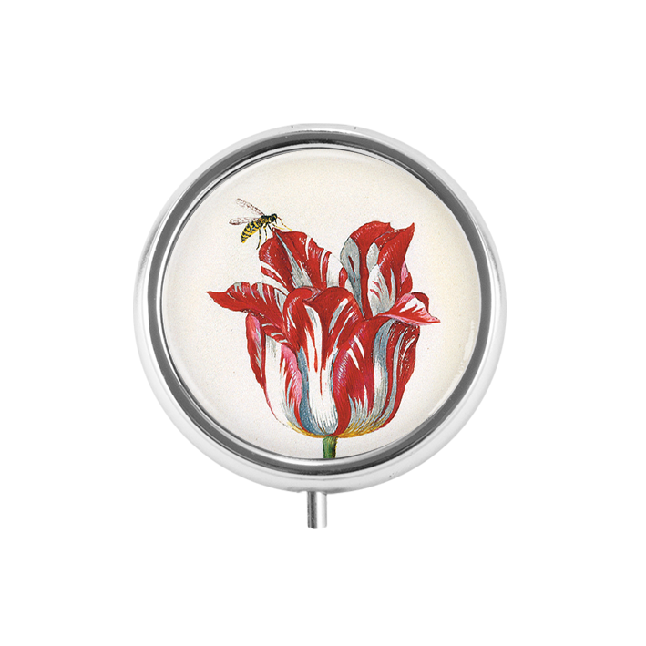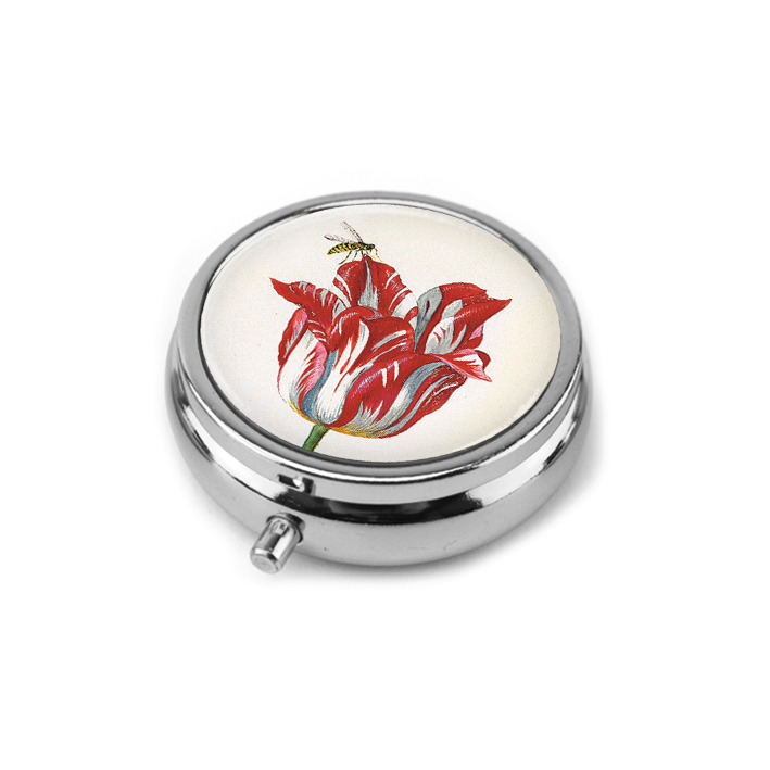 The beautiful drawing by Jacob Marrel: Tulip with bee, is now also available as an elegant pill box. With a push of a button you open the pill box and you will find three separate compartments on the inside.