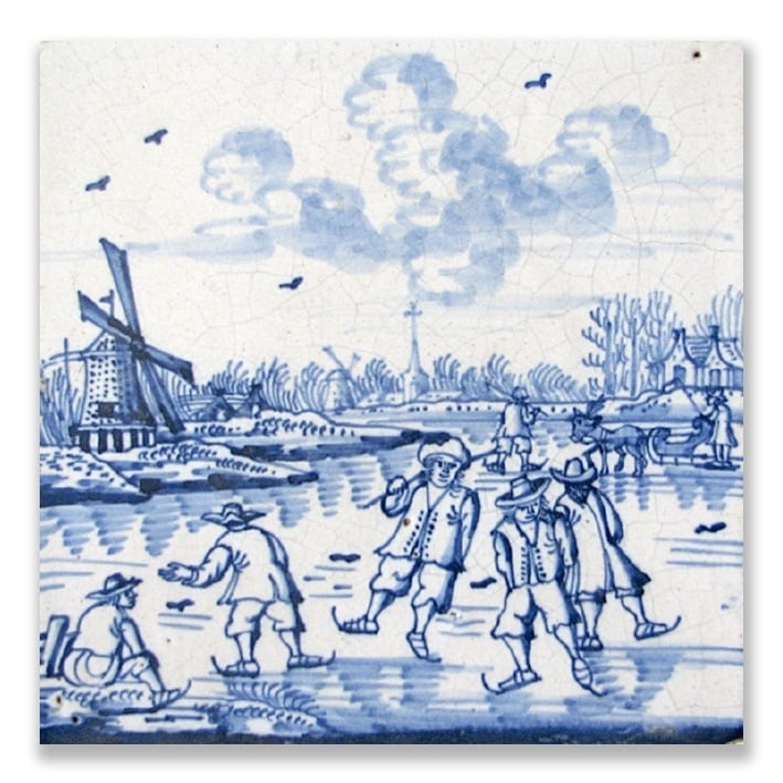 Postcard, Delft Blue Tile with Windmill and Ice Skaters