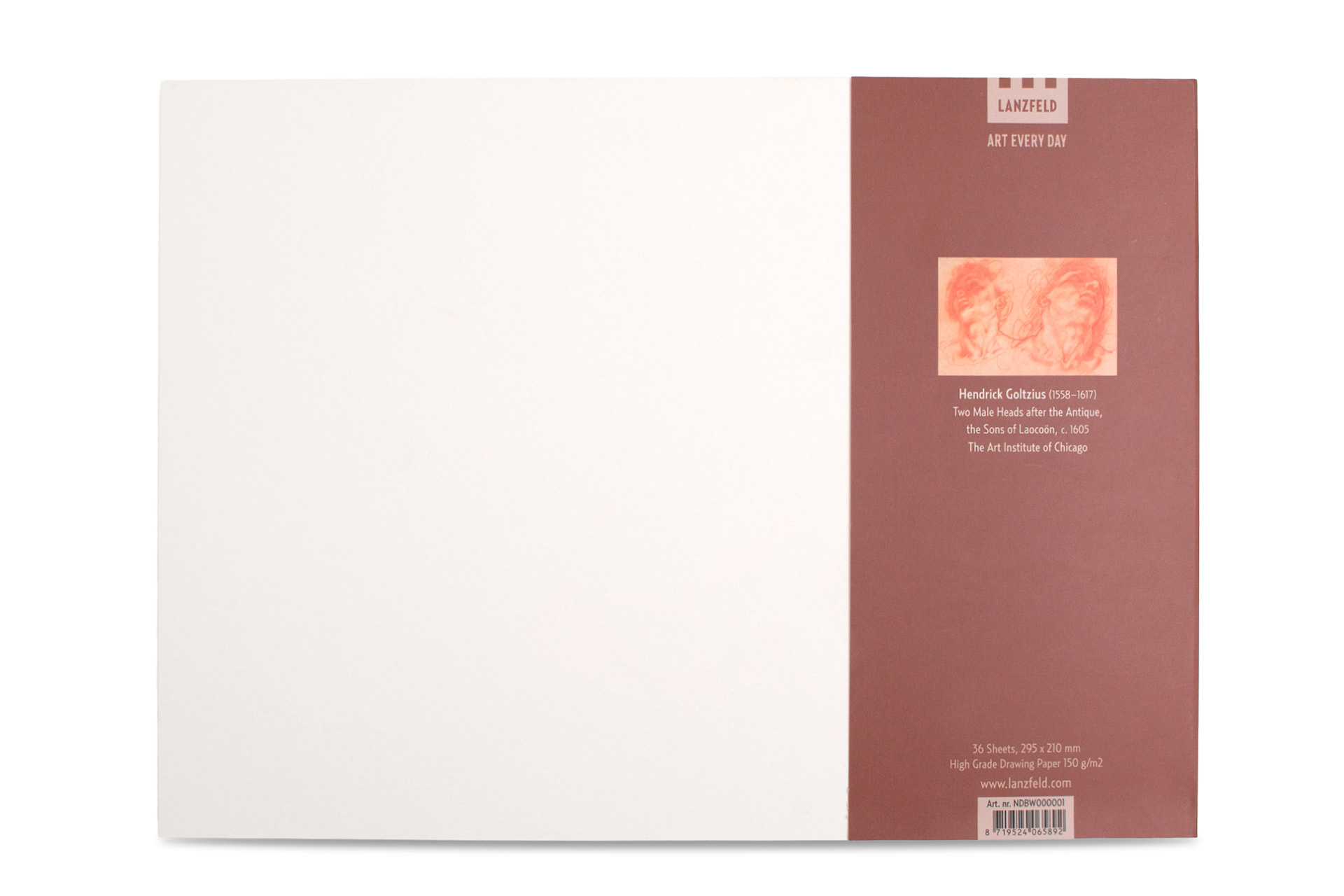 Un cuaderno de bocetos / dibujo en formato A4 , con 36 hojas desprendibles de papel de dibujo de alta calidad. En la portada hay una imagen de una obra de Hendrick Goltzius: dos cabezas de hombres.