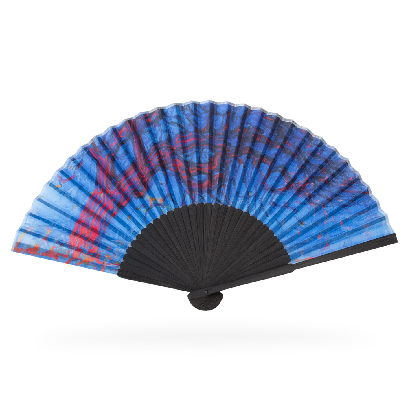 material: abanico de bambú con tela impresa en caja de cartón