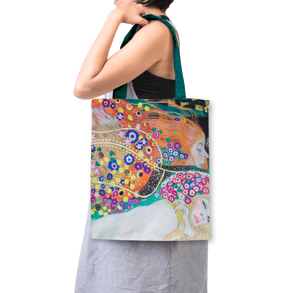 Una hermosa bolsa de algodón acolchada, resistente y de alta calidad: con esto quieres ser visto: un bonito regalo de museo. La reproducción de este bolso de calidad es del famoso cuadro de Gustav Klimt: serpientes de agua 2