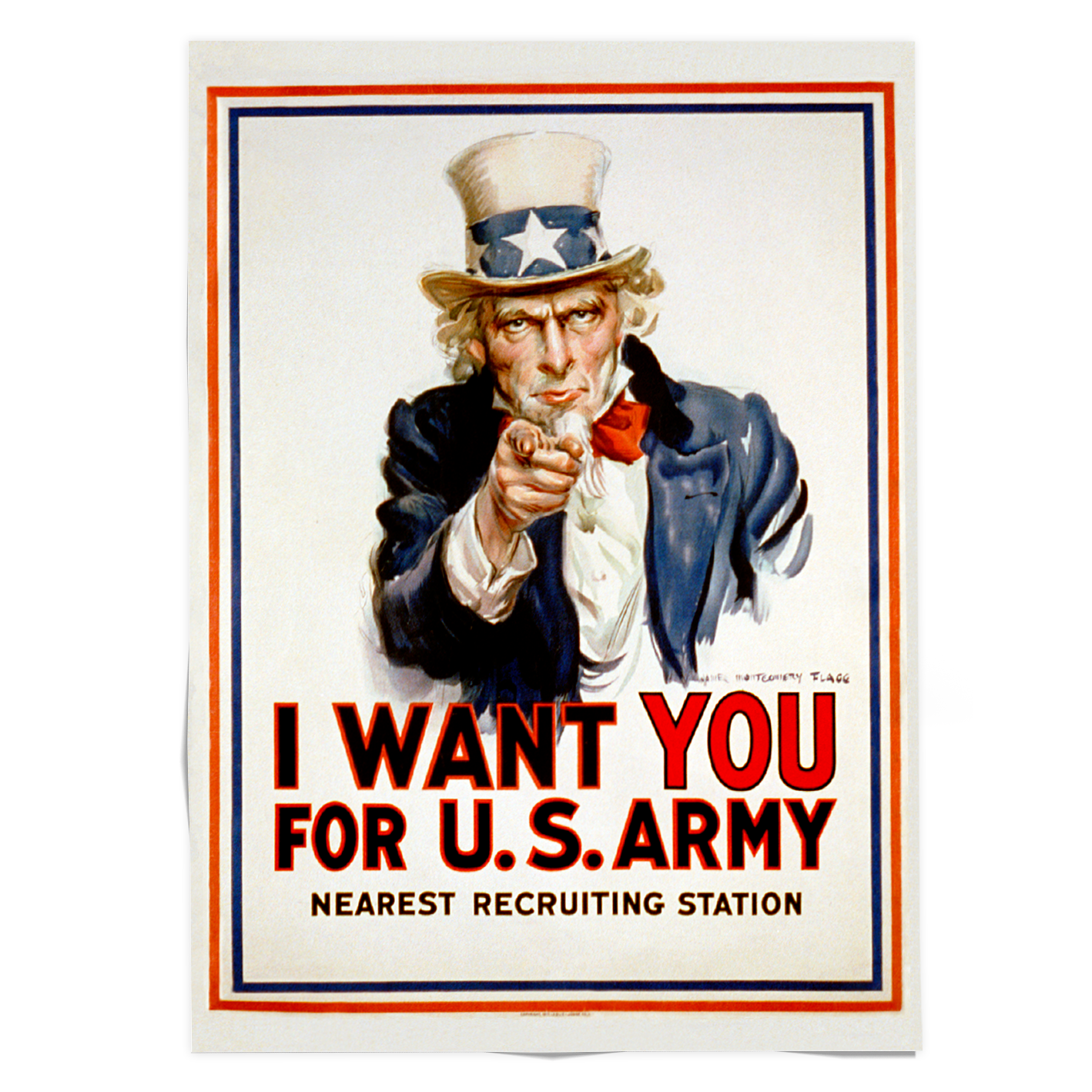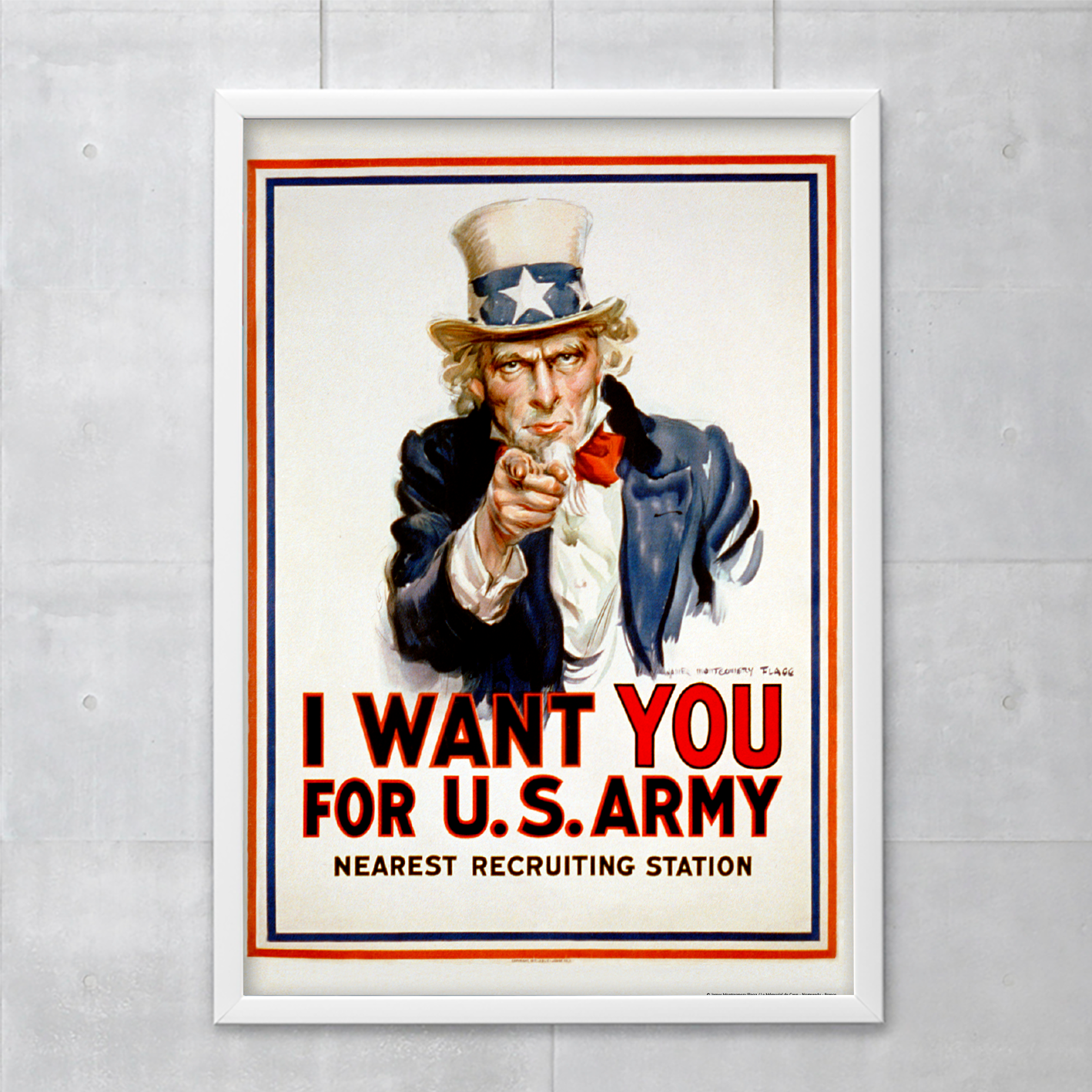 Este famoso cartel del ilustrador estadounidense James Montgomery Flagg (1877-1960) fue creado en 1917 para alentar a los jóvenes estadounidenses a unirse al Ejército de los Estados Unidos durante la Primera Guerra Mundial.
