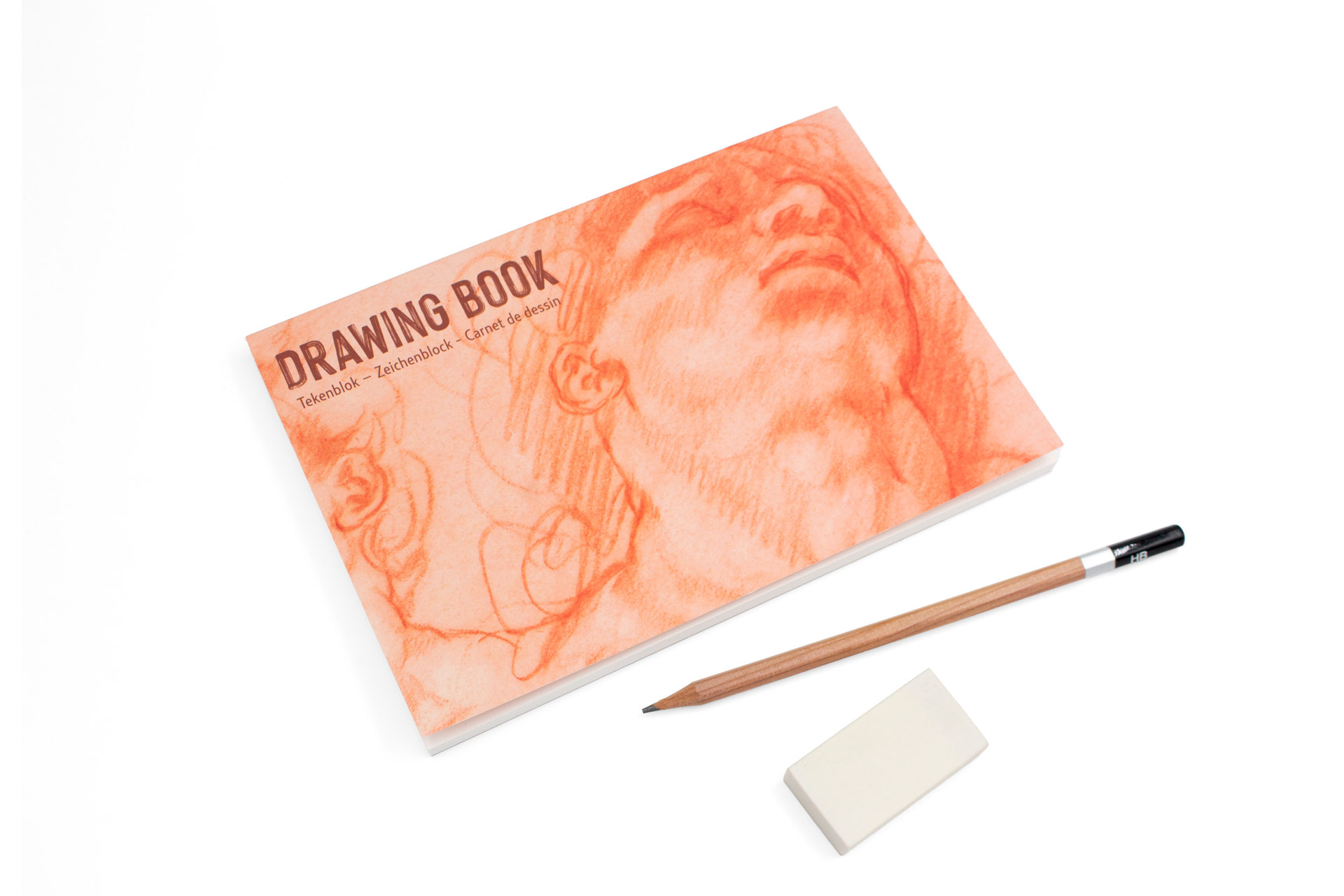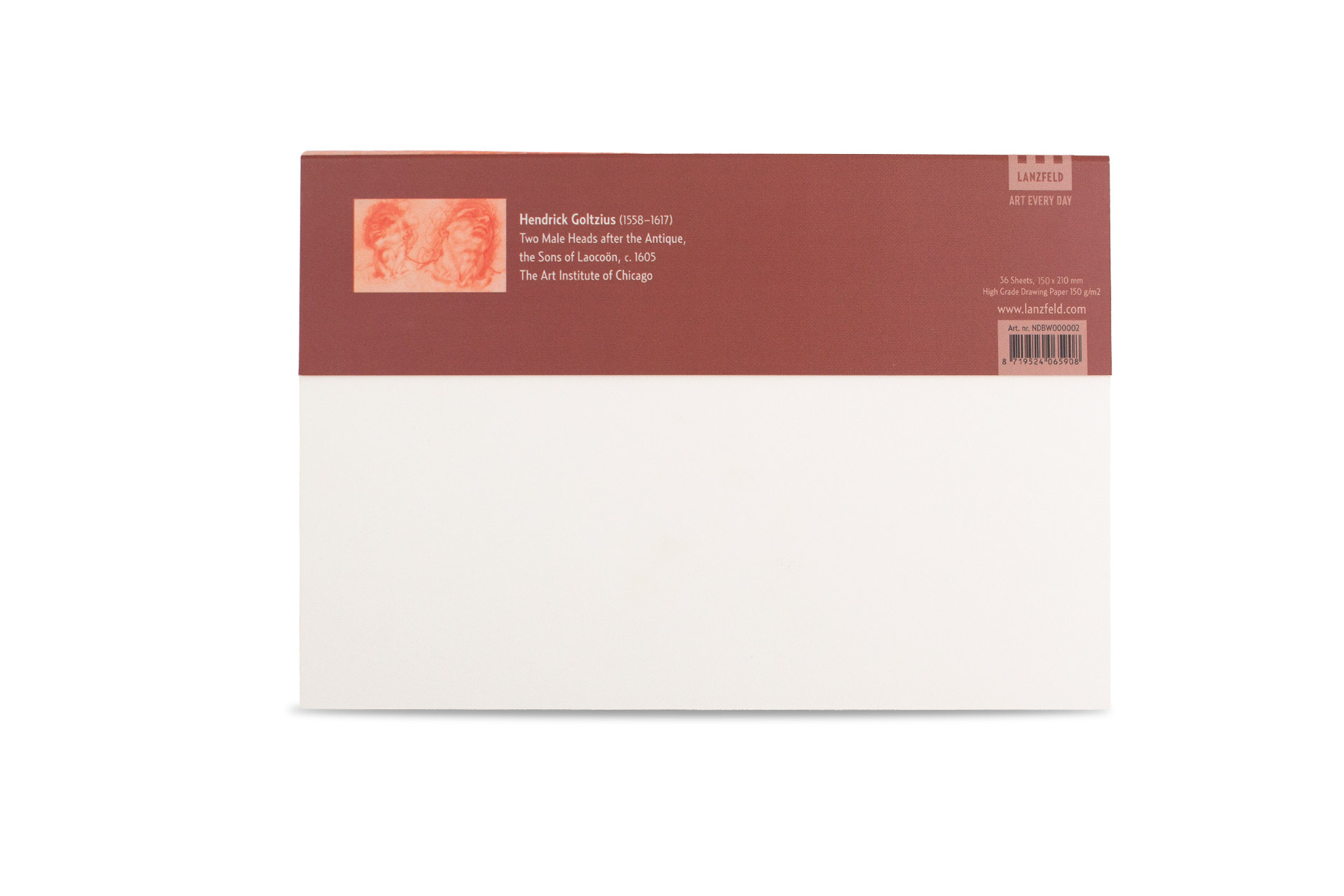 Un cuaderno de bocetos / dibujo en formato A5 , con 36 hojas desprendibles de papel de dibujo de alta calidad. En la portada hay una imagen de una obra de Hendrick Goltzius: dos cabezas de hombres.