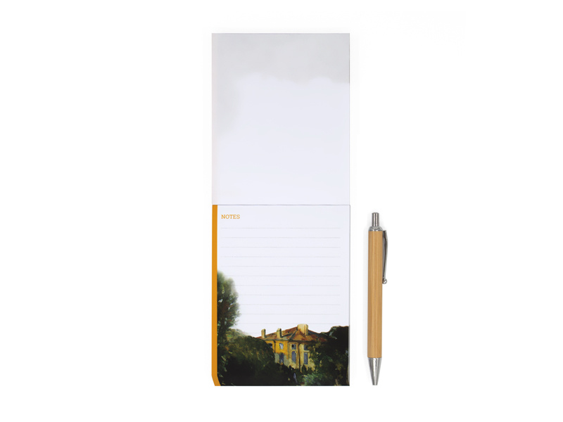 Este bloc de notas Memo Block (bloque superior) tiene un lado inclinado en el frente. Cada página del bloc de notas está impresa con la misma imagen. El Topblok está fabricado con papel blanco de 90 gramos, pegado sobre una base de cartón blanco de 300 gramos.