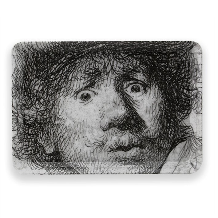Una bandeja con una impresión del famoso autorretrato de Rembrandt van Rijn; Mirada sorprendida La bandeja está hecha de melamina y, por lo tanto, apta para lavavajillas, pero no es adecuada para su uso en el microondas.