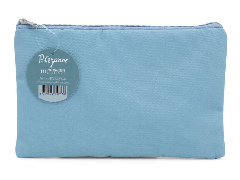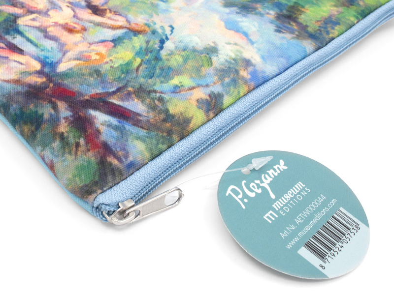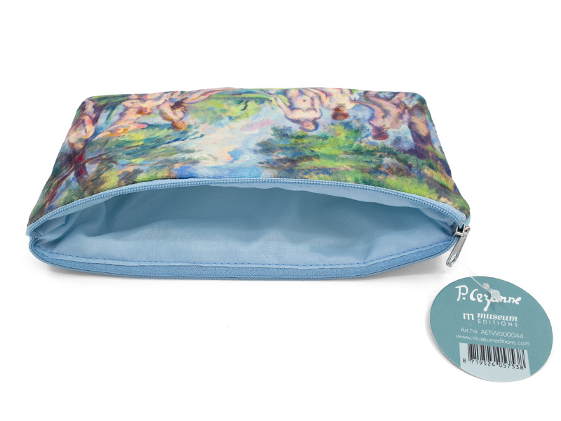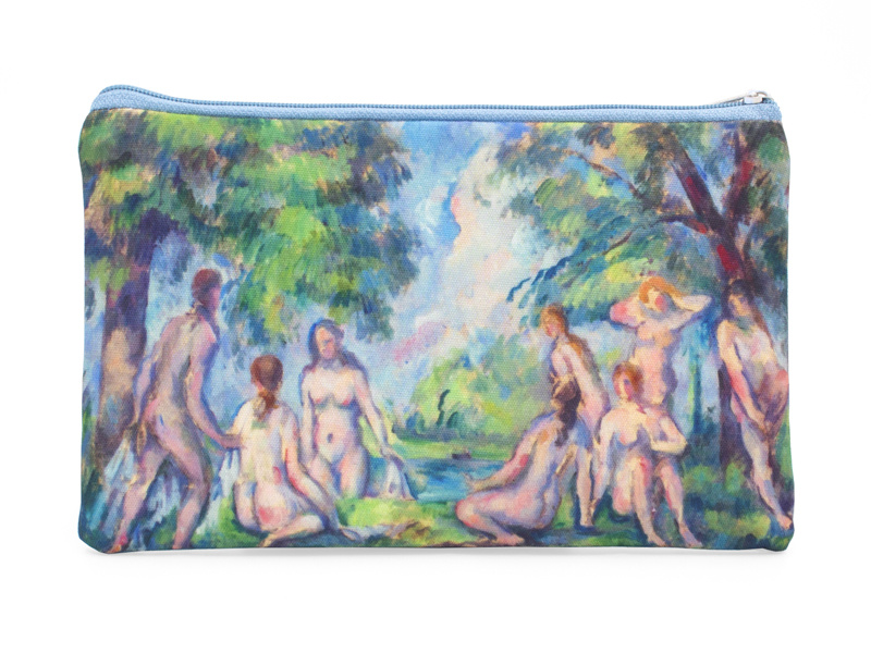 Una bolsa de maquillaje hermosa y moderna que también puedes usar como estuche para lápices, neceser o como bolsa de viaje. El bolso está forrado, tiene una cremallera y tiene una hermosa impresión de una pintura de Paul Cézanne , Las bañistas