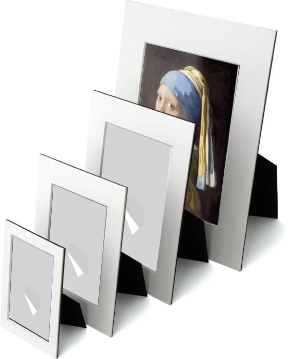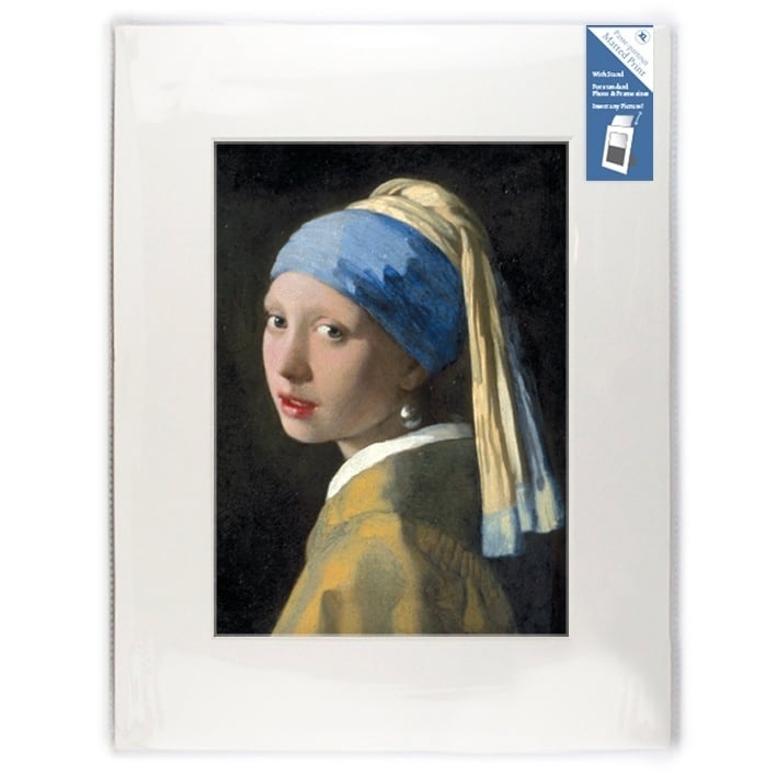 Una hermosa impresión de calidad de las pinturas más famosas de Johannes Vermeer; La chica de la perla. El paspartú tiene un práctico ojo colgante, pero también tiene un práctico soporte para que pueda ponerse de pie.