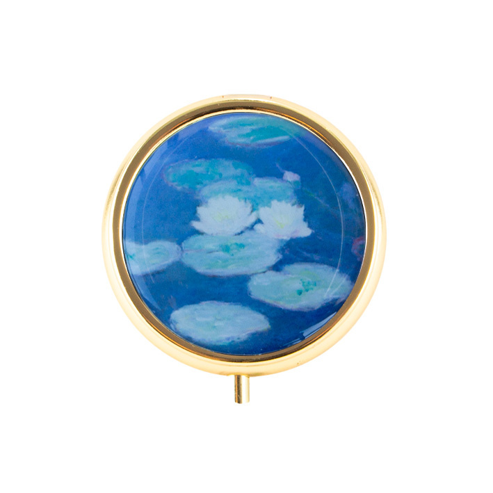 La pintura, Nenúfares a la luz del atardecer, fue pintada por Claude Monet. En nuestra tienda del museo ahora también encontrará este pastillero con la impresión de esta pintura de Monet. Con solo presionar un botón, abre el pastillero y encontrará tres c