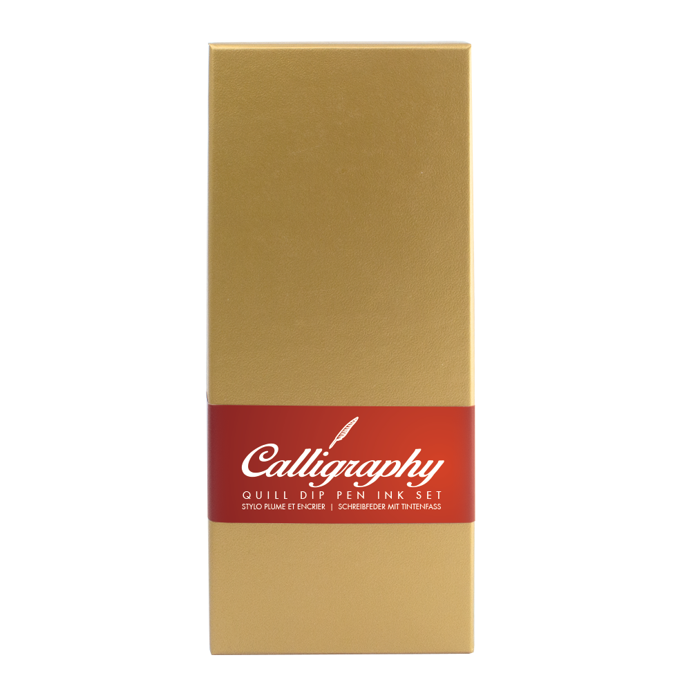 Caja de caligrafía, plumín rojo burdeos, caja de oro claro