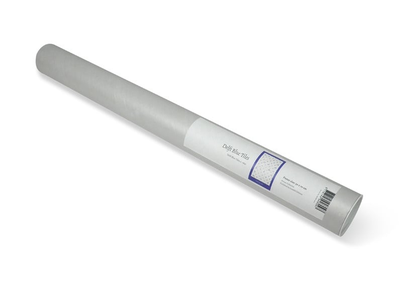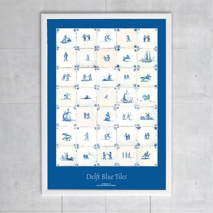 Un póster que muestra 35 fichas azules de Delft diferentes. El cartel, con un tamaño de 50 x 70 centímetros, está impreso en papel grueso y empaquetado en un tubo transparente con la información del producto.