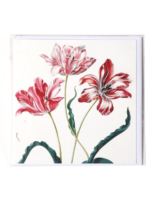 Con una impresión de una imagen de tulipanes holandeses antiguos pintada por Merian.