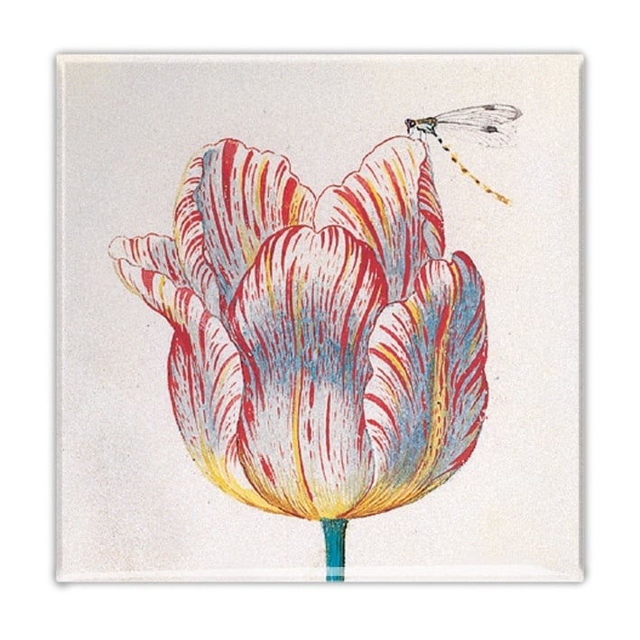 Magnet de réfrigérateur carré. Agréable pour égayer la porte de votre réfrigérateur ! Cet aimant de réfrigérateur présente l'image d'une tulipe botanique blanche : magnifiquement peinte par Jacob Marrel.