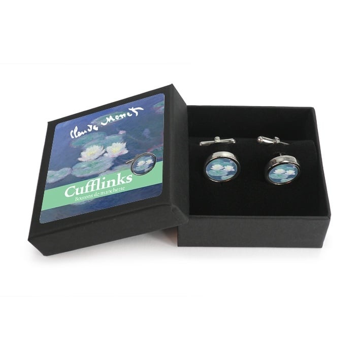 Ces boutons de manchette ronds présentent une célèbre peinture de Monet: des nénuphars à la lumière du soir. Les boutons de manchette ronds sont en acier inoxydable poli et sont livrés dans un luxueux coffret cadeau.