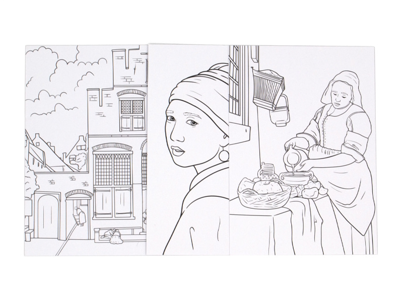 Un ensemble de 3 cartes à colorier, avec les célèbres œuvres d'art de Johannes Vermeer : La Jeune Fille à la Perle, La Laitière et La Petite Rue de Vermeer Créez votre propre chef-d'œuvre !