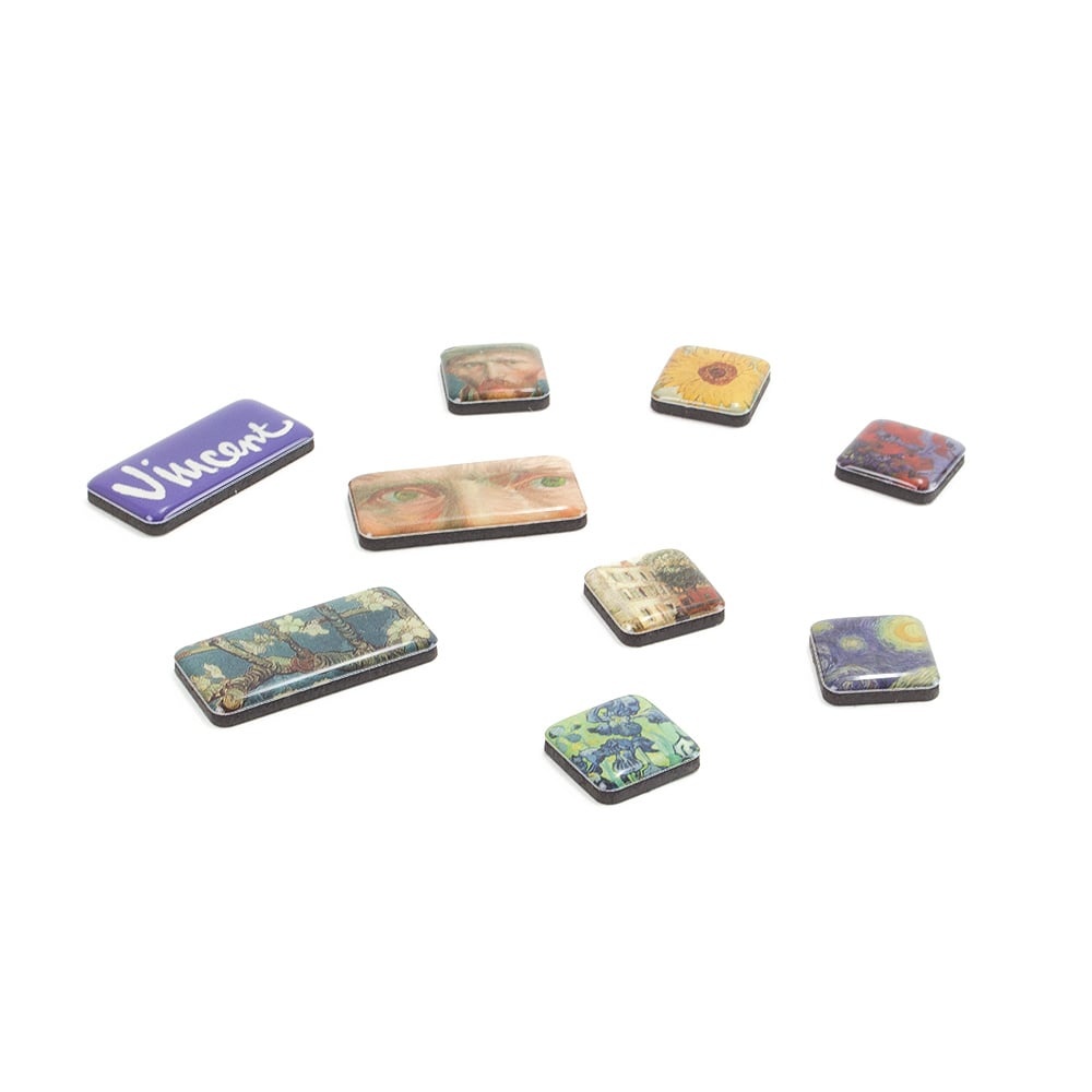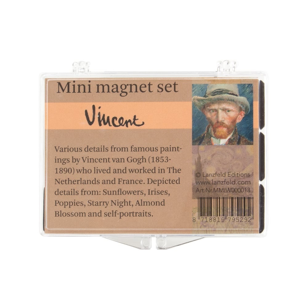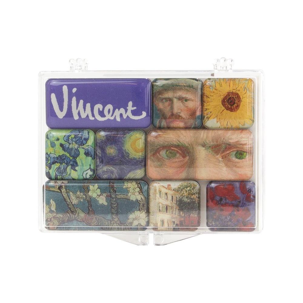 Mini aimant pour réfrigérateur avec 8 aimants pour réfrigérateur Vincent Van Gogh dans une boîte cadeau transparente. Grand cadeau ou souvenir de musée. MMIW000013 Dimensions 9,4 x 6,8 x 1 cm