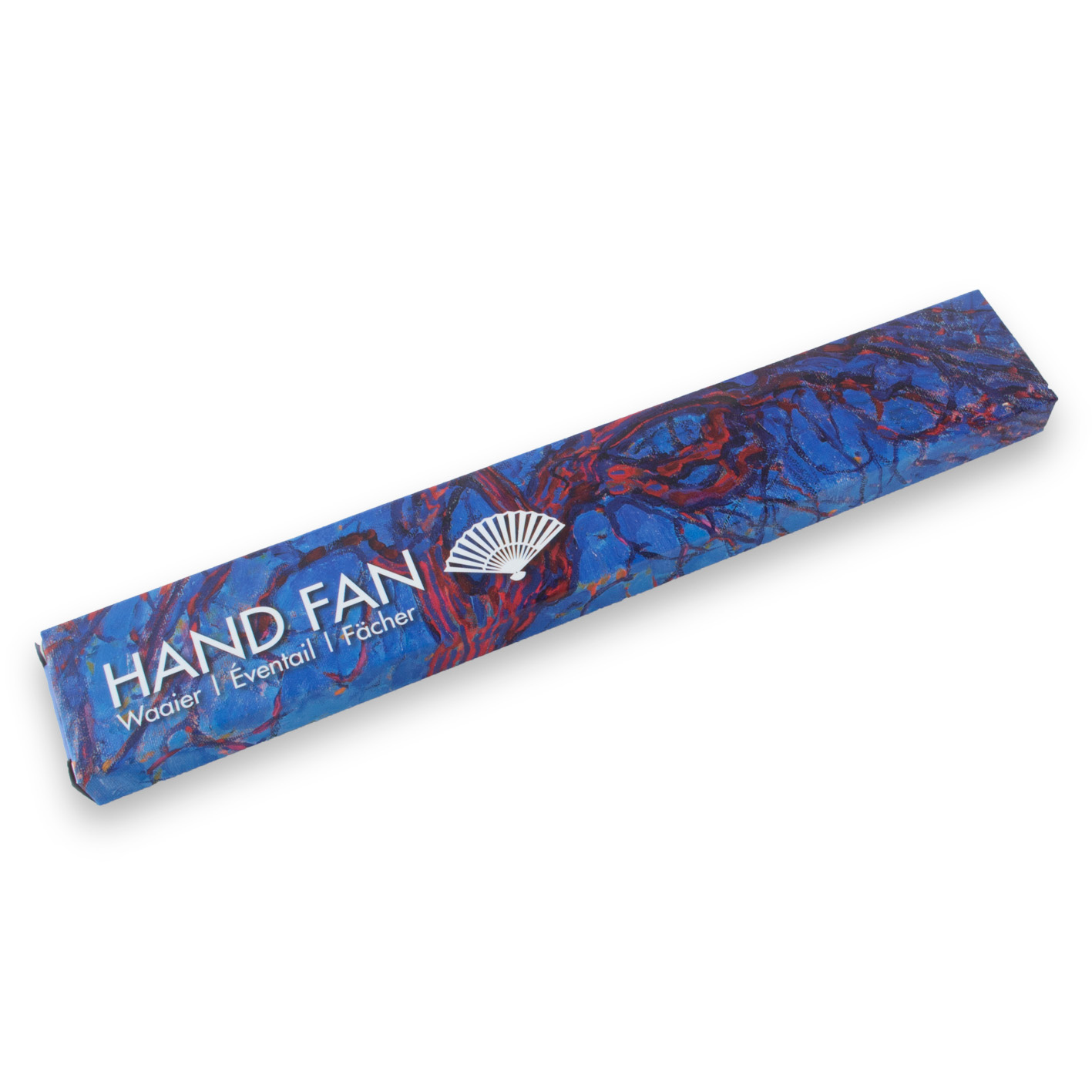matériel: éventail en bambou avec tissu imprimé dans une boîte en carton