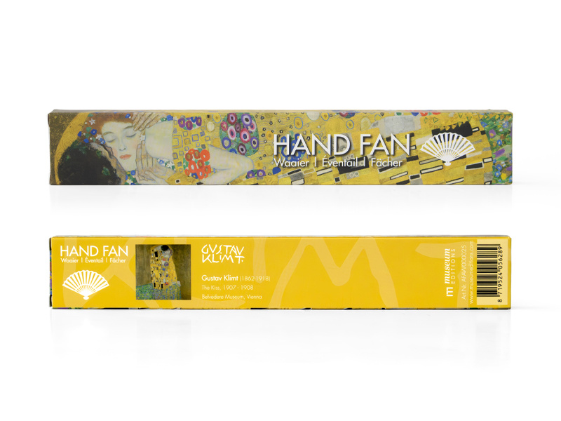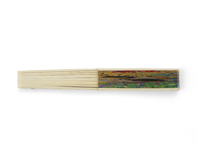 matériel: éventail en bambou avec tissu imprimé dans une boîte en carton