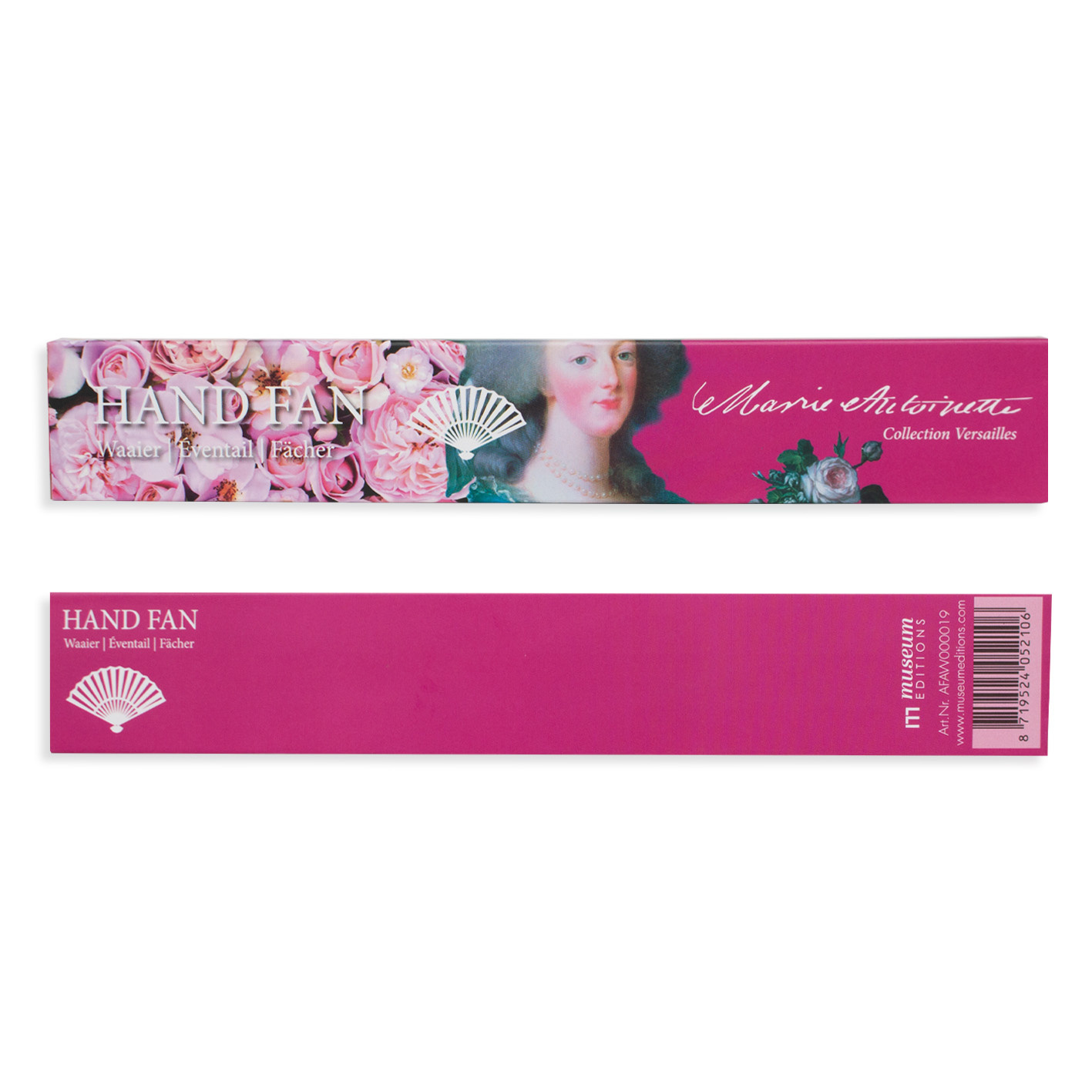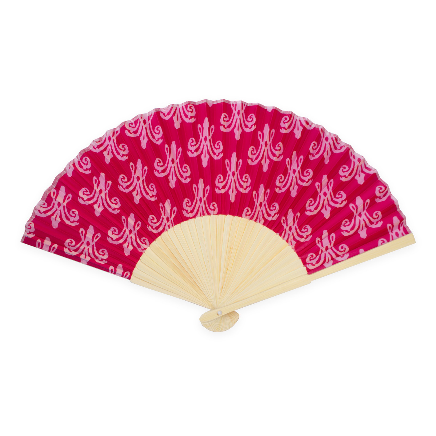 matériel: éventail en bambou avec tissu imprimé dans une boîte en carton