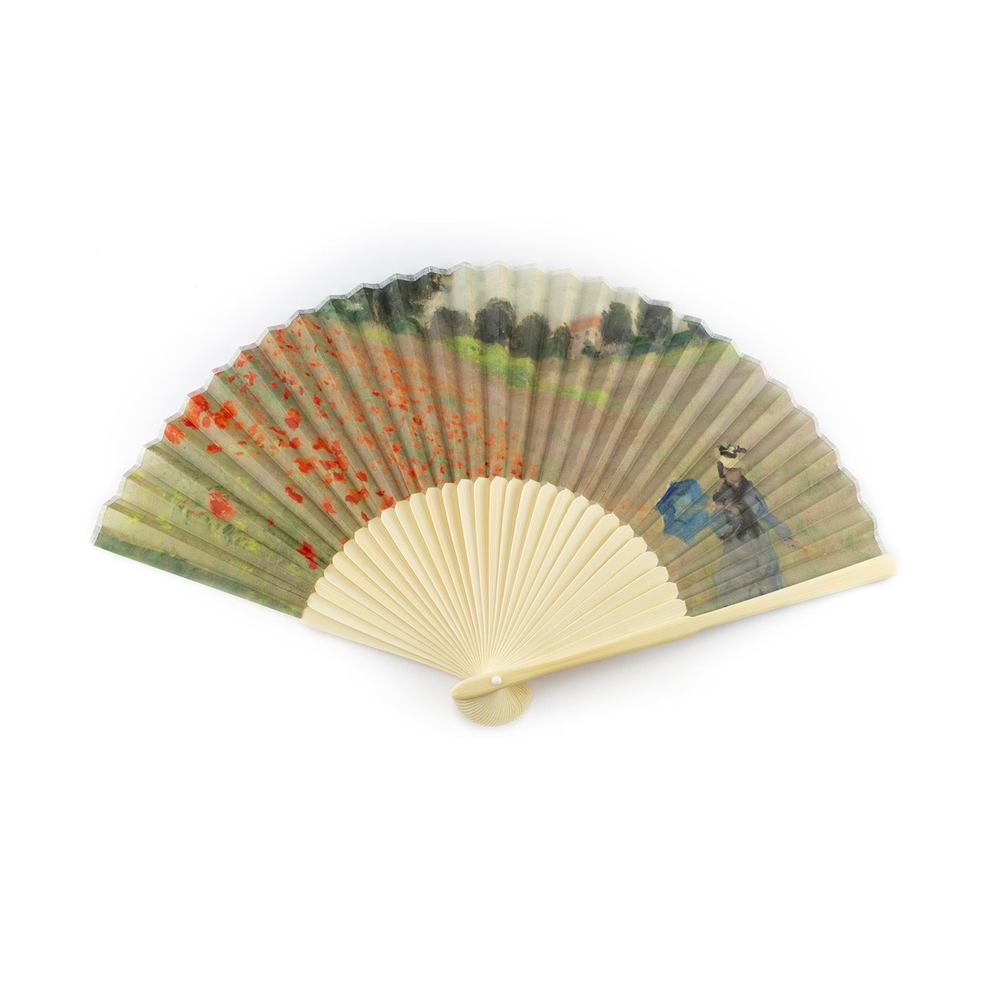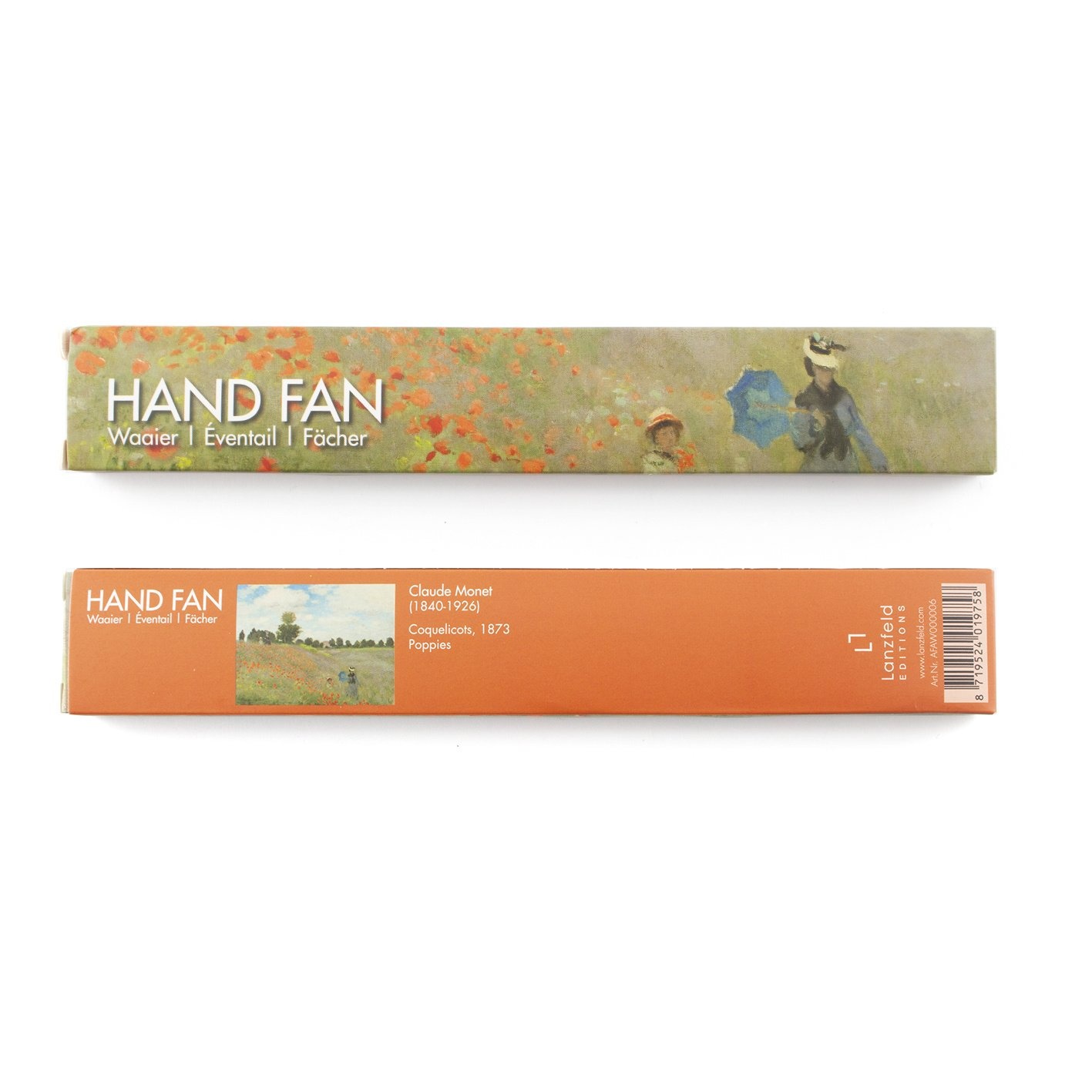 matériel: éventail en bambou avec tissu imprimé dans une boîte en carton