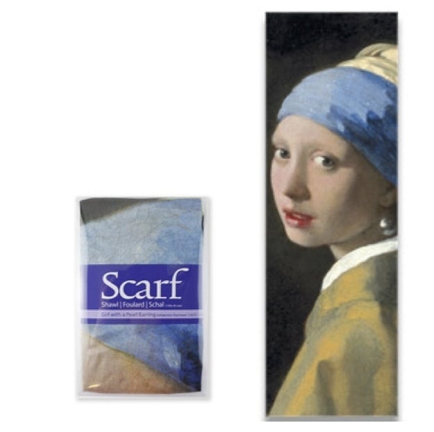 Une belle écharpe avec un imprimé très raffiné et des couleurs vives et intenses: basée sur la célèbre peinture de La Fille aux boucles d'oreilles en perles de Johannes Vermeer. L'écharpe est en soie artificielle (100% polyester). Le foulard est agréable