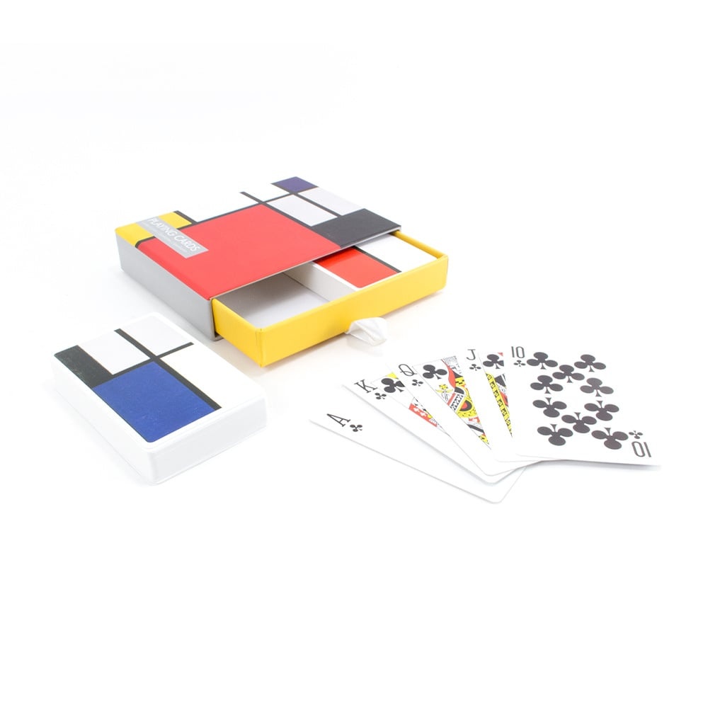 Un joli lot de 2 cartes à jouer dans une boîte de rangement de luxe, avec tiroir. Les cartes sont imprimées avec une œuvre d'art peinte par le célèbre artiste néerlandais Piet Mondrian. 56 cartes par jeu