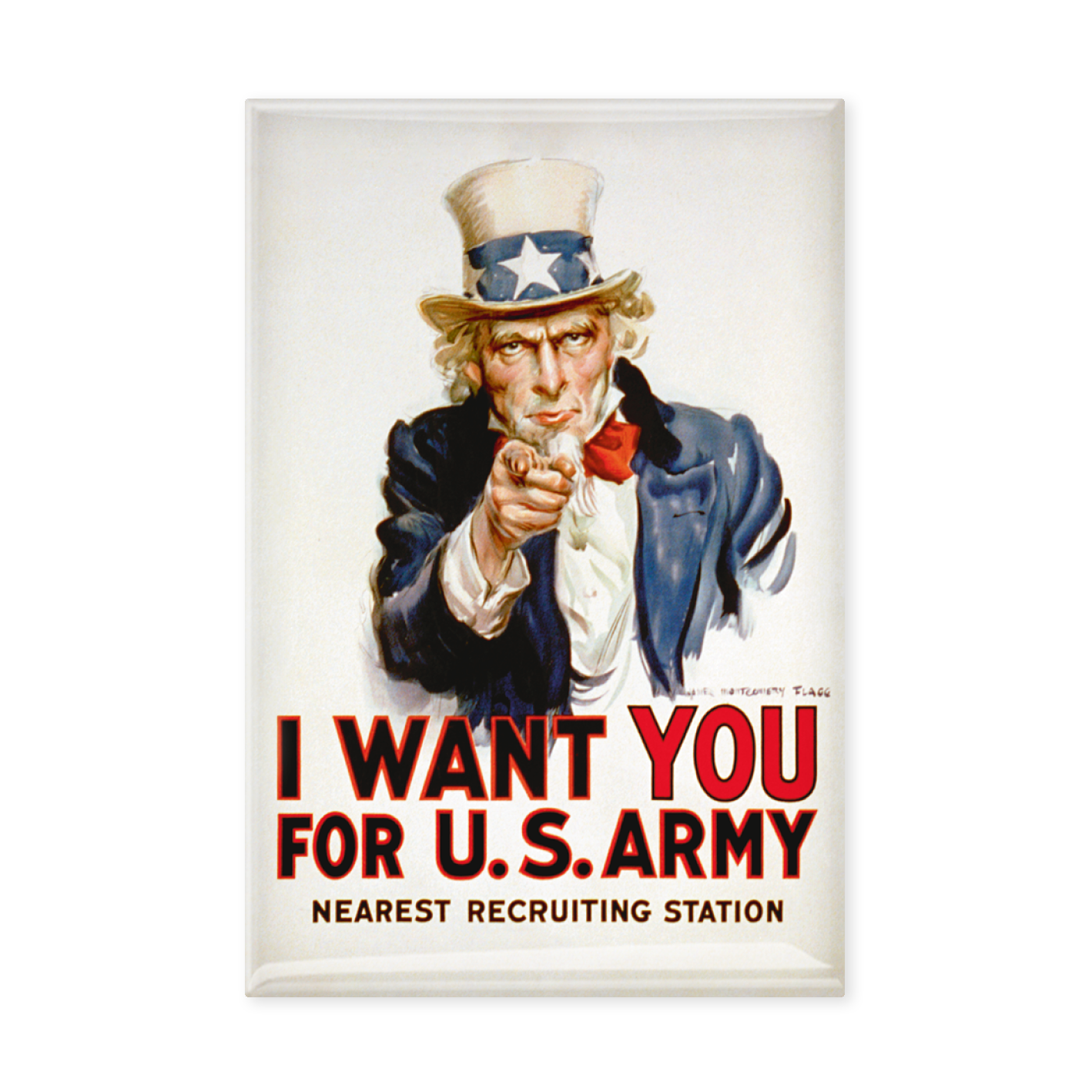 Cet aimant présente une impression de qualité de la célèbre affiche de l'illustrateur américain James Montgomery Flagg (1877-1960) a été créé en 1917 pour encourager les jeunes Américains à rejoindre l'armée américaine pendant la Première Guerre mondiale.