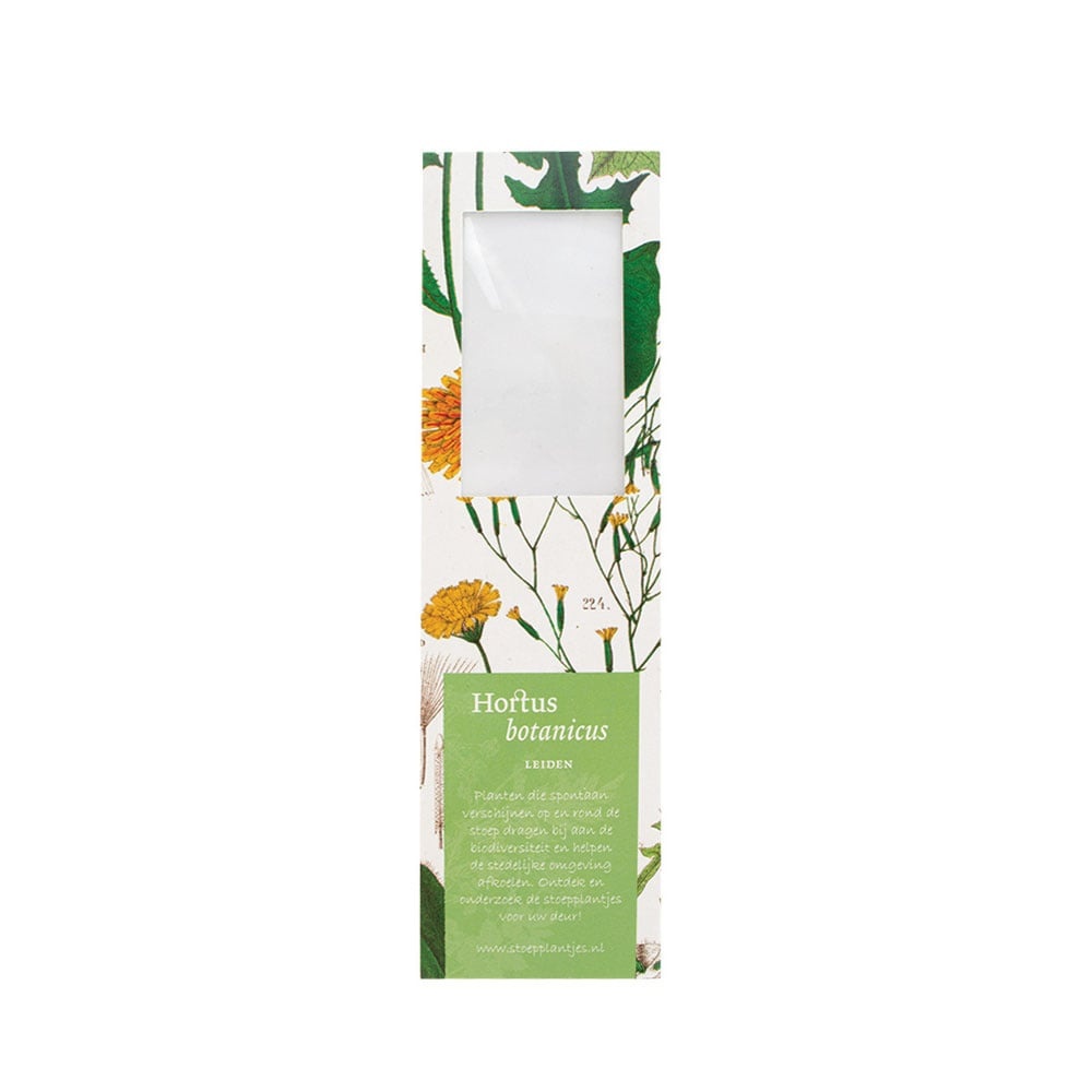 Un marque-page pratique, conçu pour le projet «Stoepplantjes», une initiative de Hortus Botanicus Leiden, Pays-Bas. Avec une fenêtre avec une loupe qui grossit 2 x. La taille de ce marque-page est de 58 x 200 mm et est fait de carton imprimé brillant et s