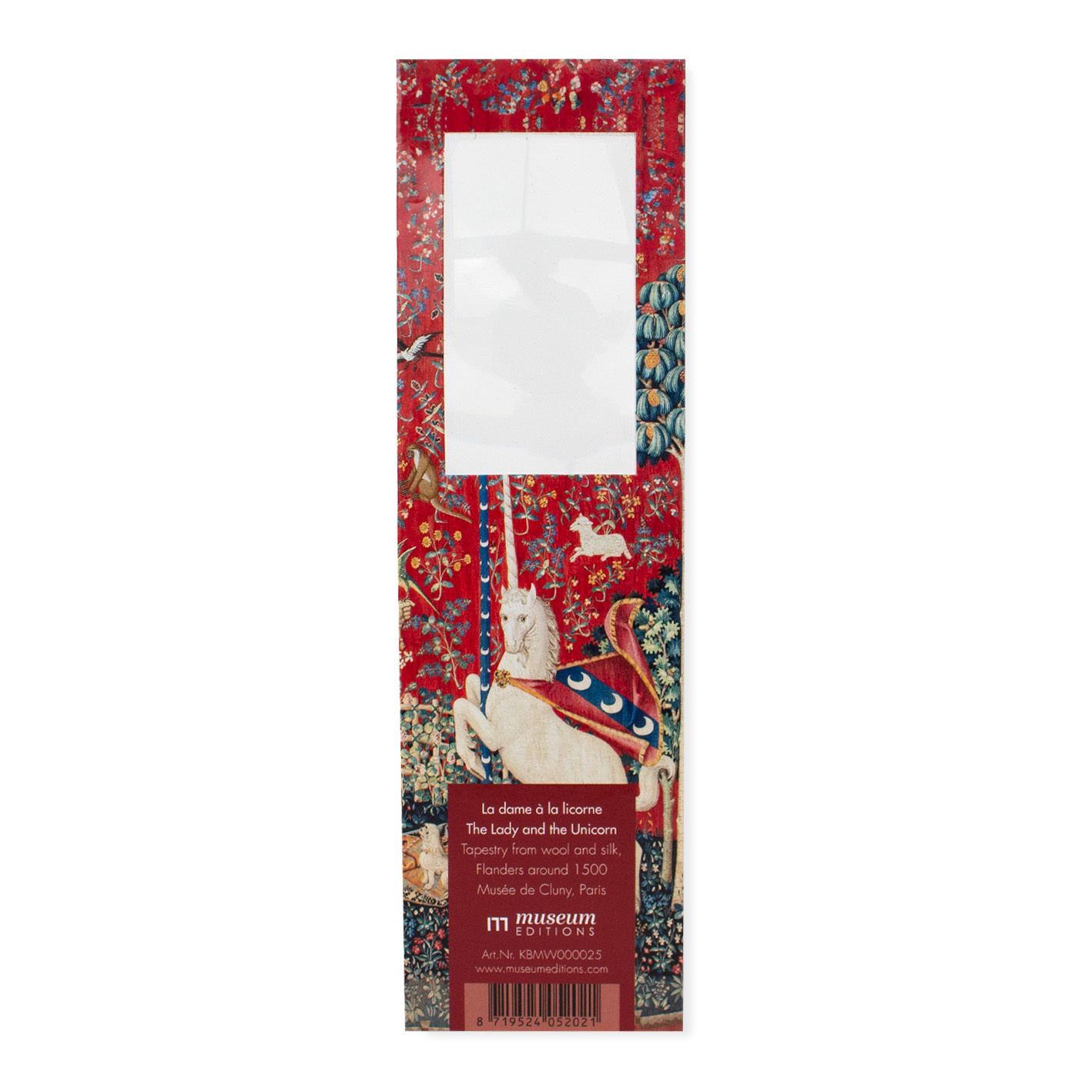 Un marque-page pratique avec une fenêtre avec une loupe qui grossit 2 x. Le format de ce marque-page est de 58 x 200 mm et est fait de carton imprimé brillant et solide. La loupe est en plastique.