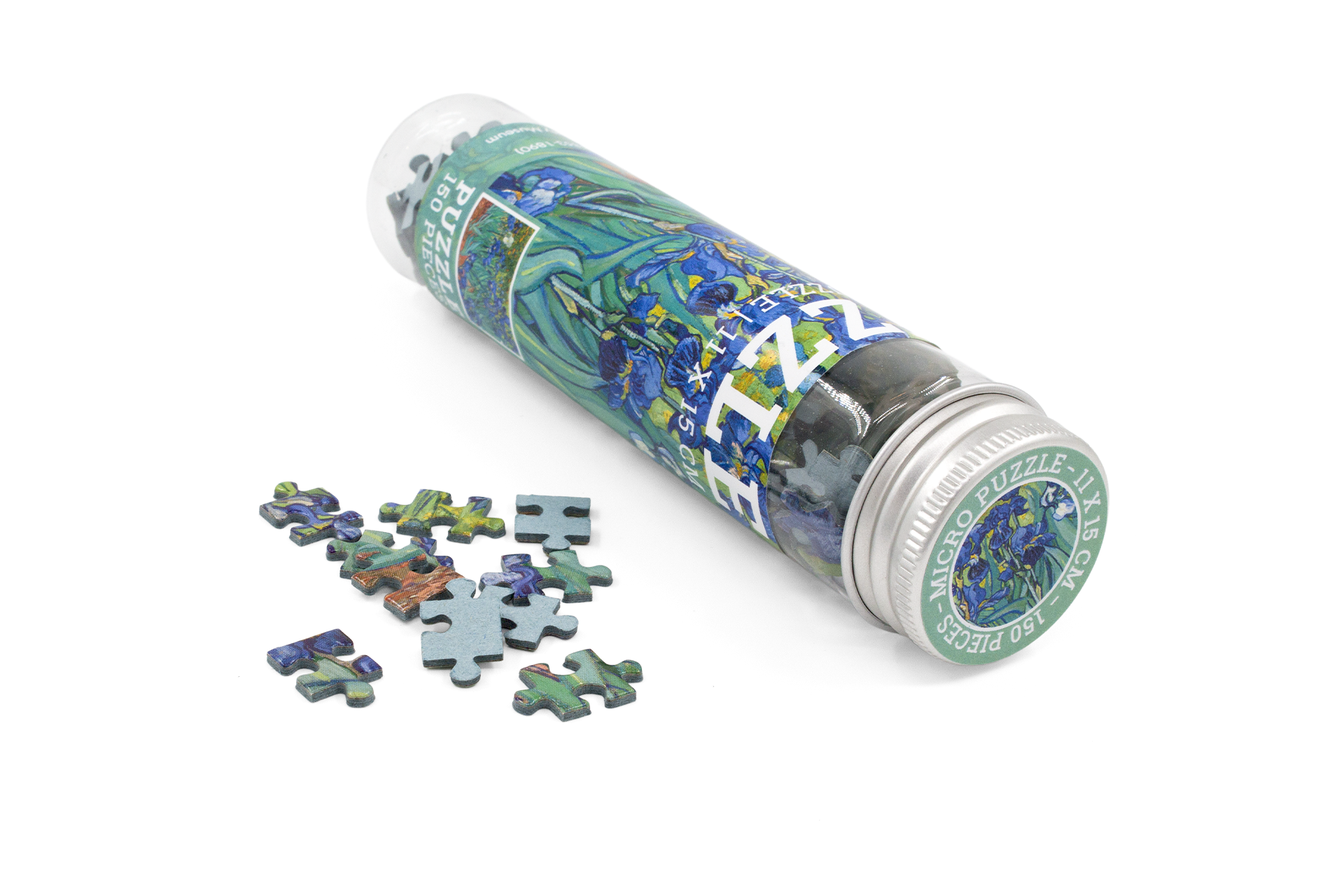 Mini-puzzle de Iris, Vincent van Gogh Ce puzzle de 150 pièces est présenté dans un tube avec bouchon à vis. Dimensions : 10 x 15 cm Marque : Museum-merchandise.com