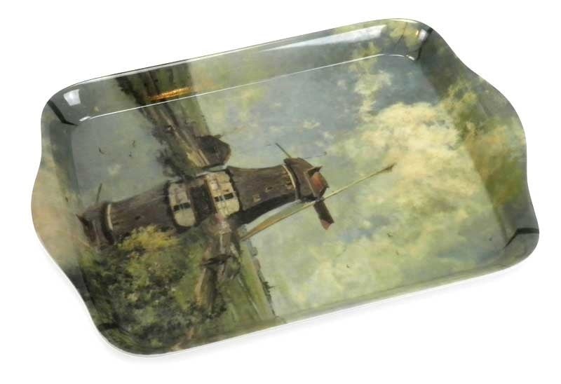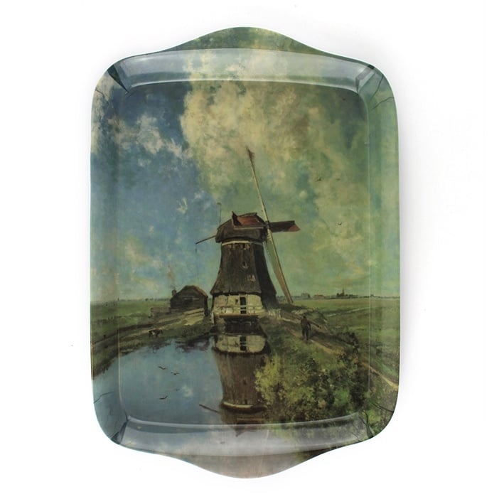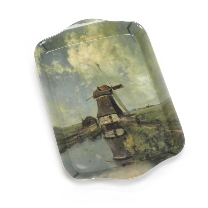 Ein Tablett mit dem Druck einer Mühle auf einem Polderkanal, gemalt von Joseph Constantin Gabriel. Das Originalgemälde befindet sich im Rijksmuseum in Asterdam. Das Tablett besteht aus Melamin und ist daher spülmaschinenfest, jedoch nicht für die Verwendu