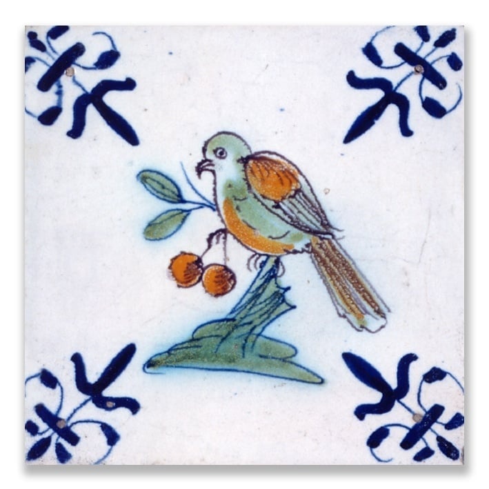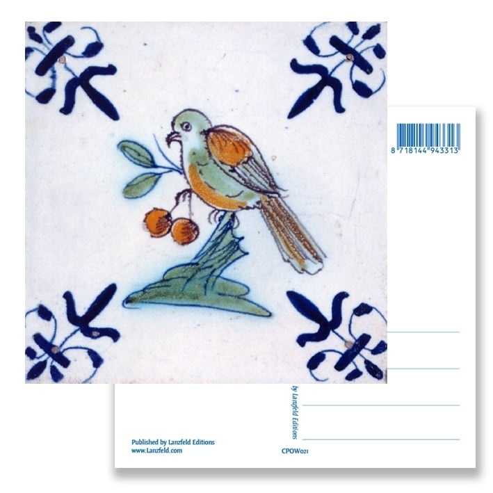 Carte postale, tuile bleue de Delft Oiseau aux fruits rouges