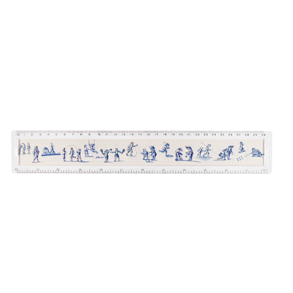 Règle, tuiles bleues de Delft. Tailles en centimètres et en pouces: 30 cm et 12 pouces.