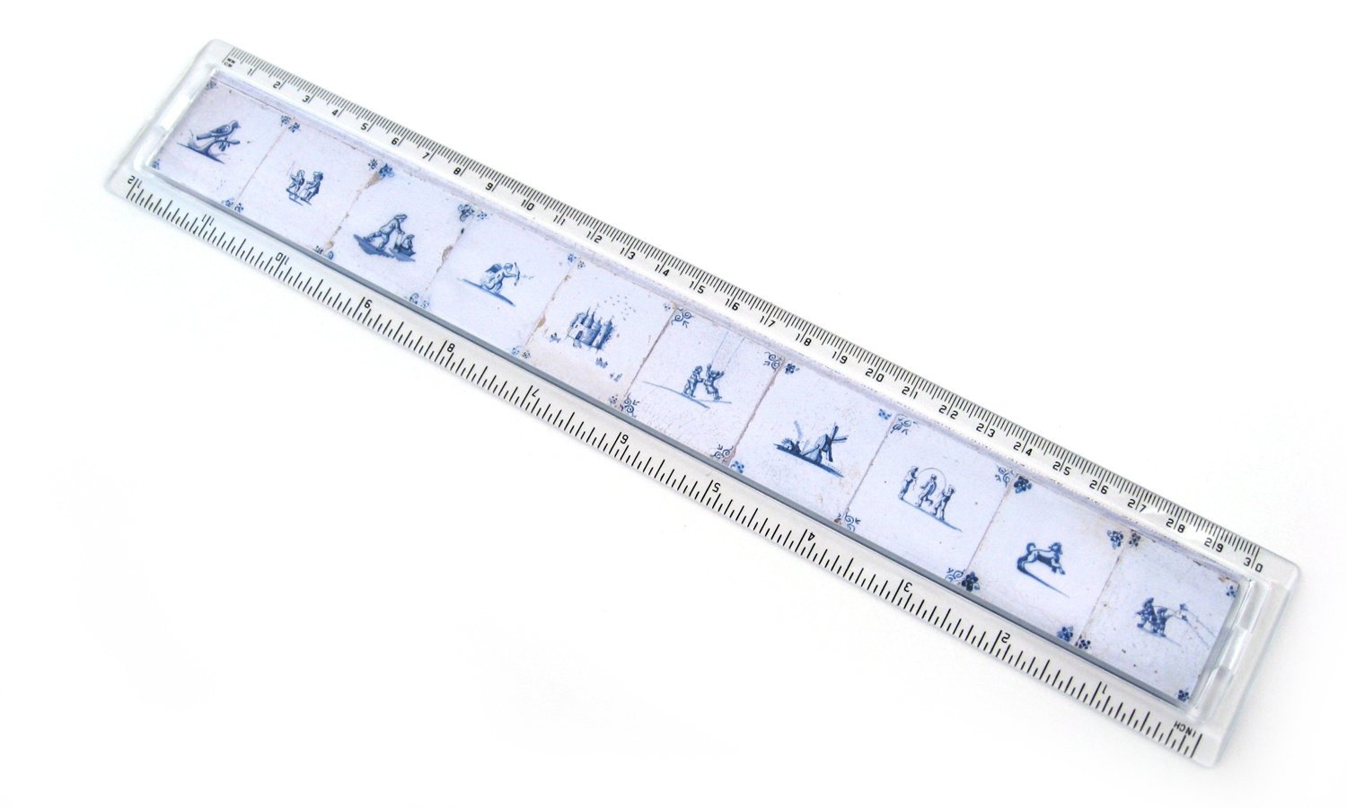 Règle, tuiles bleues de Delft. Tailles en centimètres et en pouces: 30 cm et 12 pouces.