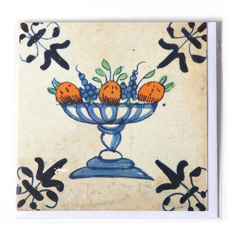 Fruitschaal met sinaasappels en druiven, Delfts Blauw. Dubbele kaart, vierkant, met envelop