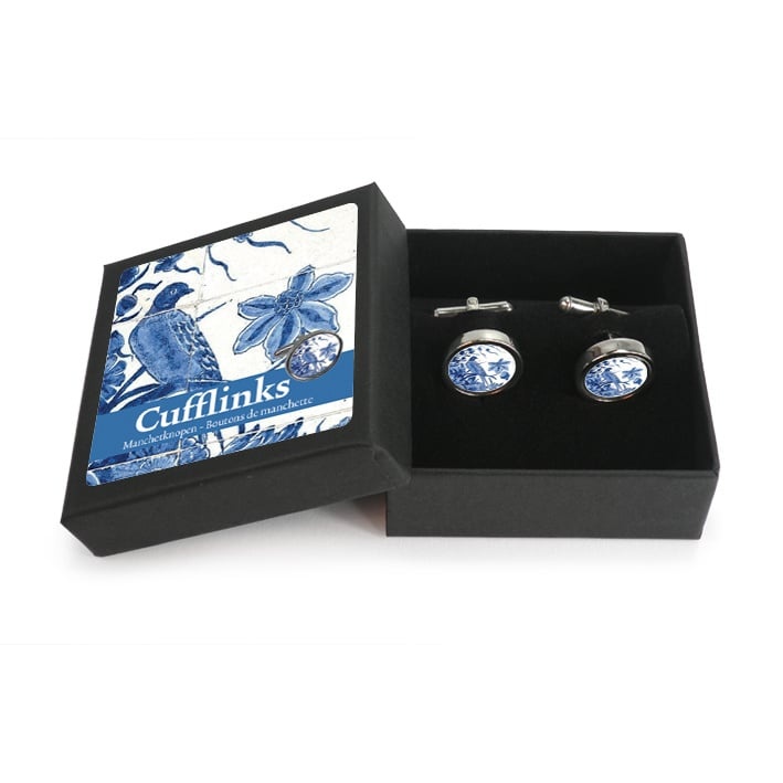 Deze prachtige ronde manchetknopen hebben een stijlvolle en mooie afdruk van een Delfts blauw tegeltableau met vogels. De manchetknopen zijn gemaakt van gepolijst roestvrijstaal en worden geleverd in een stijlvolle geschenkverpakking.