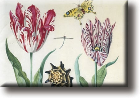 Koelkastmagneet, Twee tulpen, schelp en insecten, Marrel