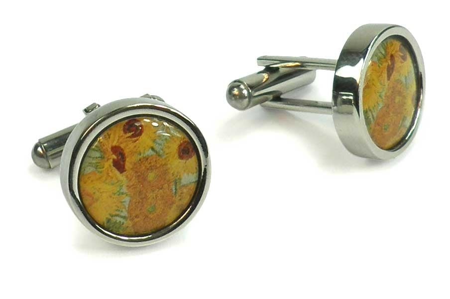 Misschien wel de bekendste zonnebloemen ter wereld; Zonnebloemen geschilderd in 1888 door de wereldberoemde kunstenaar Vincent van Gogh (1583 - 1890). Deze manchetknopen zijn voorzien van een hoge kwaliteit afdruk van Zonnebloemen en gemaakt van gepolijst