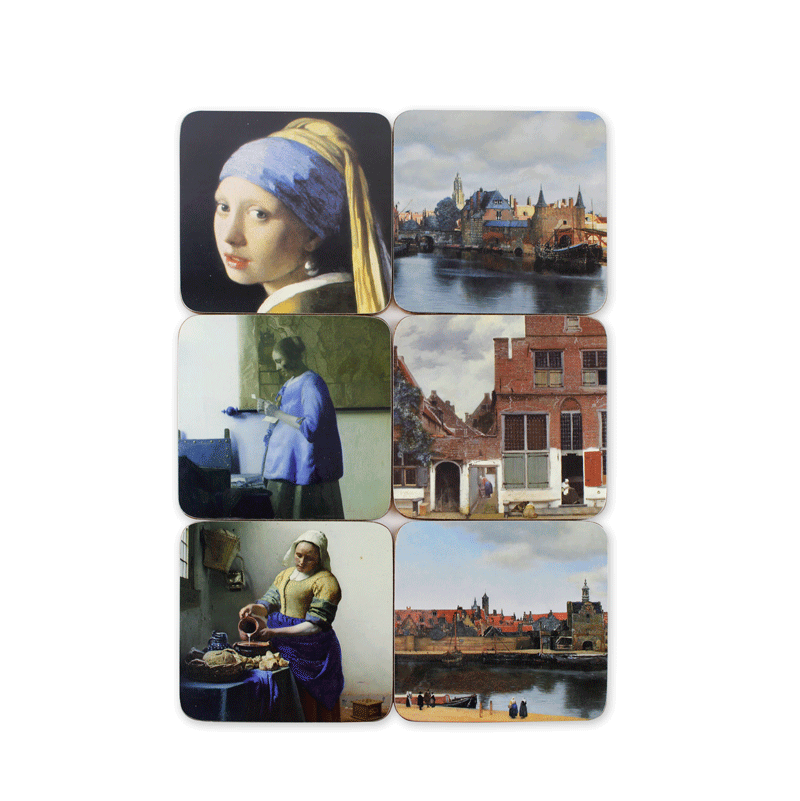Een set van 6 onderzetters met daarop de verschillende schilderijen van meesterschilder Johannes Vermeer; Meisje met de parel, De Melkmeid, Gezicht op Delft, Straatje van Vermeer, Brieflezende vrouw en Prachtig Delft. De onderzetters hebben een afmeting v