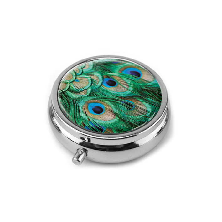 Dit zilverkleurige pillen doosje opent met een druk op het knopje. In het pillendoosje treft u aan de binnenzijde drie afgescheiden vakjes aan. Het doosje is van metaal en de vakjes van kunststof.