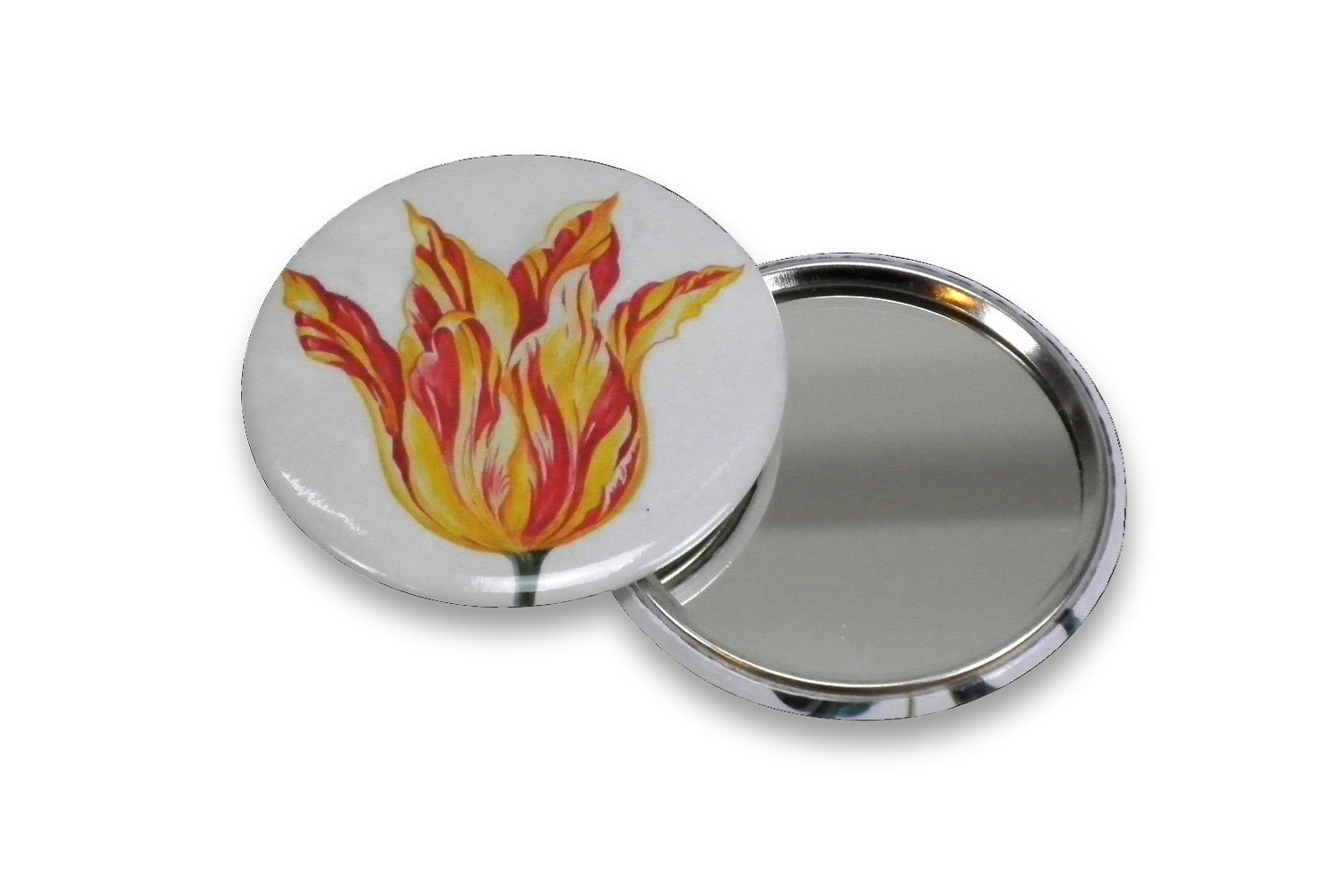 Rond spiegeltje, handig om mee te nemen bijvoorbeeld voor het bijwerken van make-up. Dit spiegeltje op zakformaat is verpakt in plastic en voorzien van een prachtige opdruk van een tekening van Jakob Marrel (1613 - 1681): Geel - Rode Tulp.