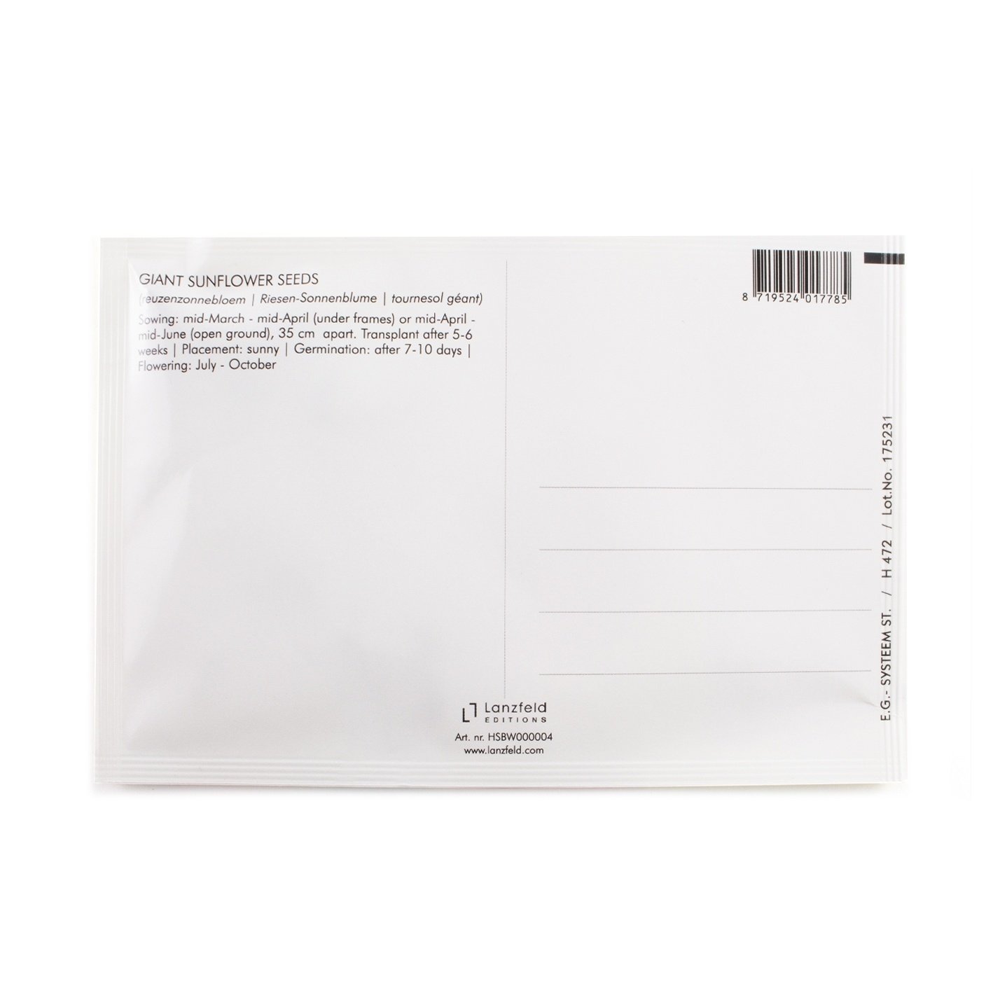Zaadjes voor zonnebloemen in een mooi zakje die je als postcard kan versturen.